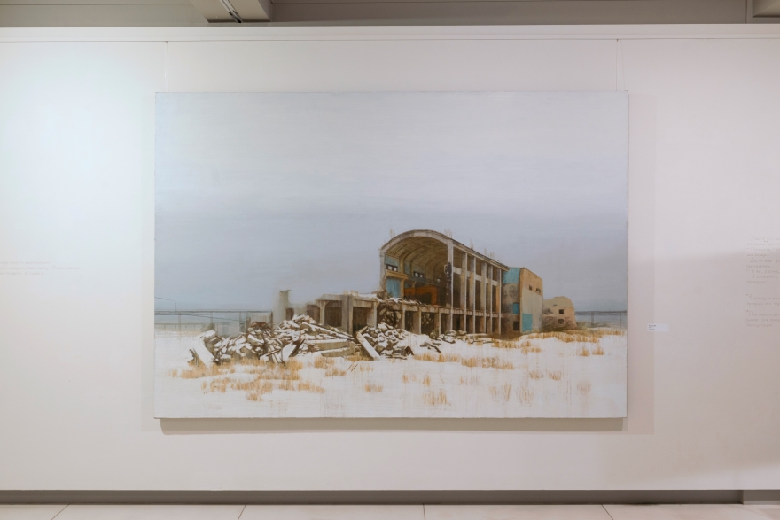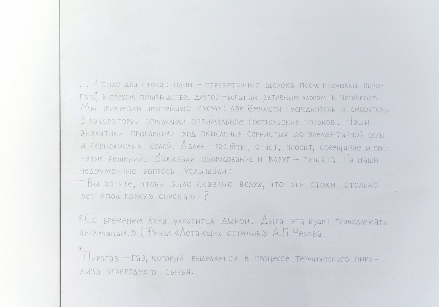 Думаю, что это был бы жанр документальной прозы, нон-фикшн. Мне представляется, что никакая антиутопия или фантастика не сравнится с документальными жанрами по выразительности. Вообще, я считаю, что это самое актуальное направление и в литературе, и в театре, и в изобразительном искусстве. Да и сама выставка «Руины» наполнена цитатами из книги «Заводские анекдоты». Это неизданное произведение поэтессы Лии Аронович, которая много лет работала в центральной заводской лаборатории одного из дзержинских предприятий. Это самый настоящий нон-фикшн, документ эпохи. Там очень своеобразный юмор, много прямой речи и специальной терминологии, связанной с производством. Я специально добавил сноски с пояснениями для таких слов, как, например, «сульфоэтоксилат», или «диоксаны». Короткие тексты как бы обрамляют картины. Голоса героев этой книги на моей выставке – это настоящие голоса призраков, населяющих заводские руины.