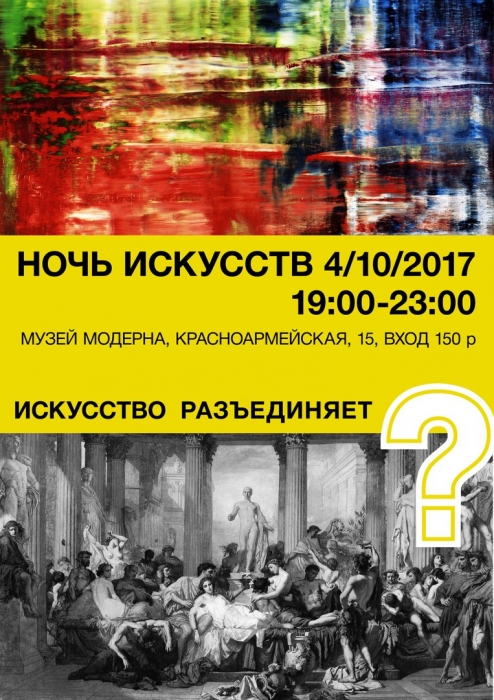 Программа Ночи искусств «Искусство разъединяет» разделена на две версии: традиционную и проблемную. Каждая занимает свой этаж, посетители смогут выбрать только одну из них.