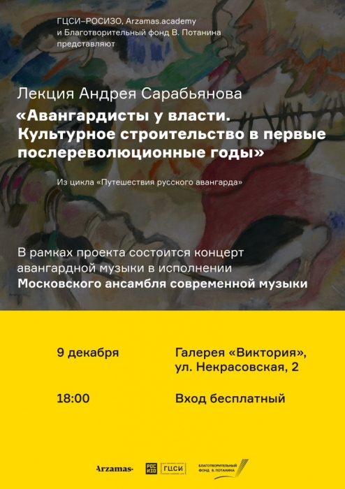 Проект «Путешествия русского авангарда» реализуют Arzamas и Благотворительный фонд В. Потанина. Это образовательный курс, состоящий из шести лекций искусствоведа, руководителя Центра авангарда и центра толерантности Андрея Сарабьянова. Бонус к курсу – демонстрация видео-материалов и живое исполнение музыкальных произведений Московским Ансамблем Современной Музыки.