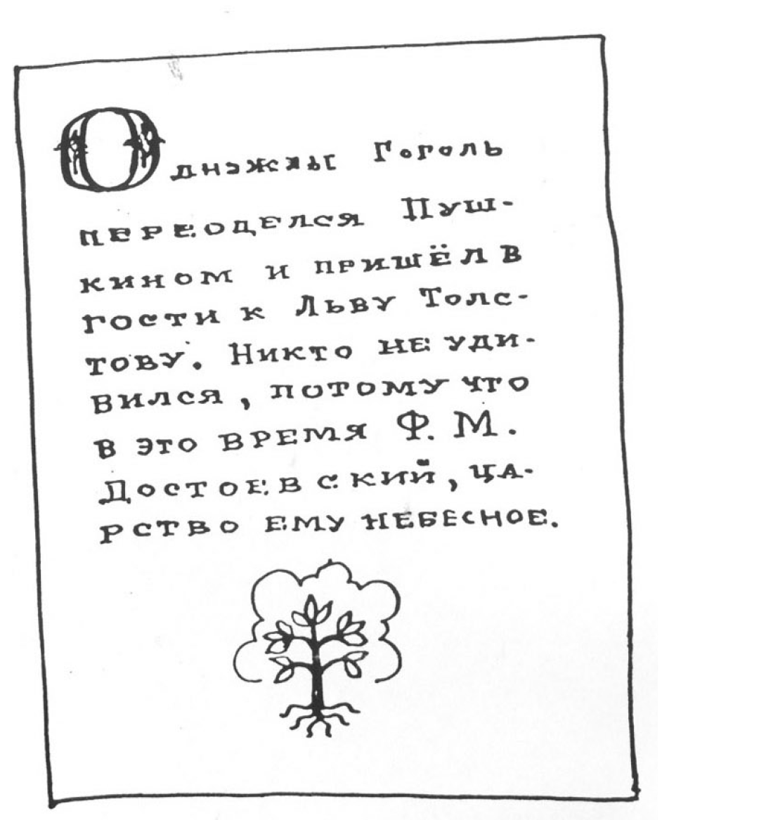 № 1 Однажды Гоголь переоделся Пушкином и пришёл в гости к Льву Толстову. Никто не удивился, потому что в это время Ф. М. Достоевский, царство ему небесное.