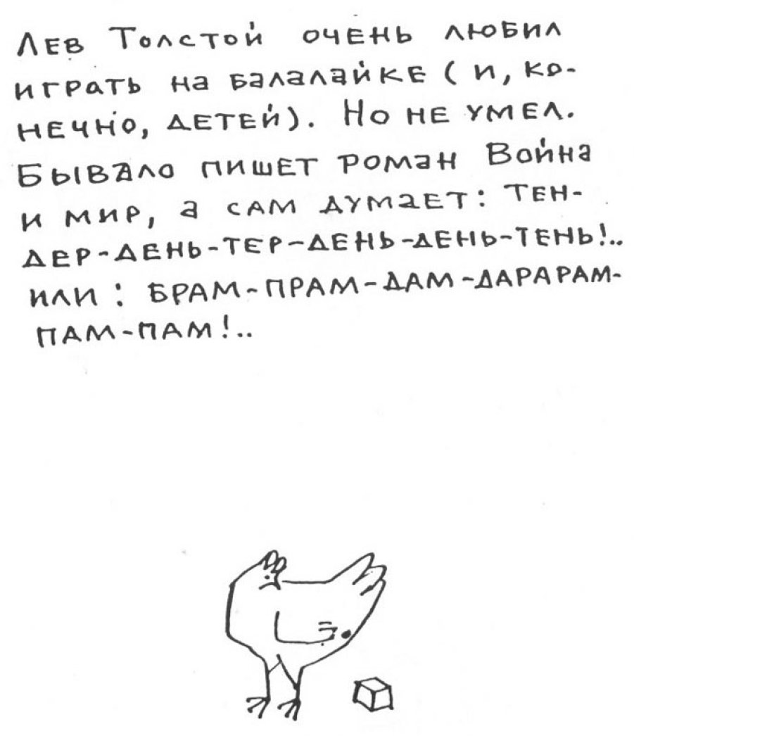№ 2 Лев Толстой очень любил играть на балалайке (и, конечно, детей). Но не умел. Бывало пишет роман Война и мир, а сам думает: Тен-дер-день-тер-день-день-тень!.. или: Брам-прам-дам-дарарам-пам-пам!..