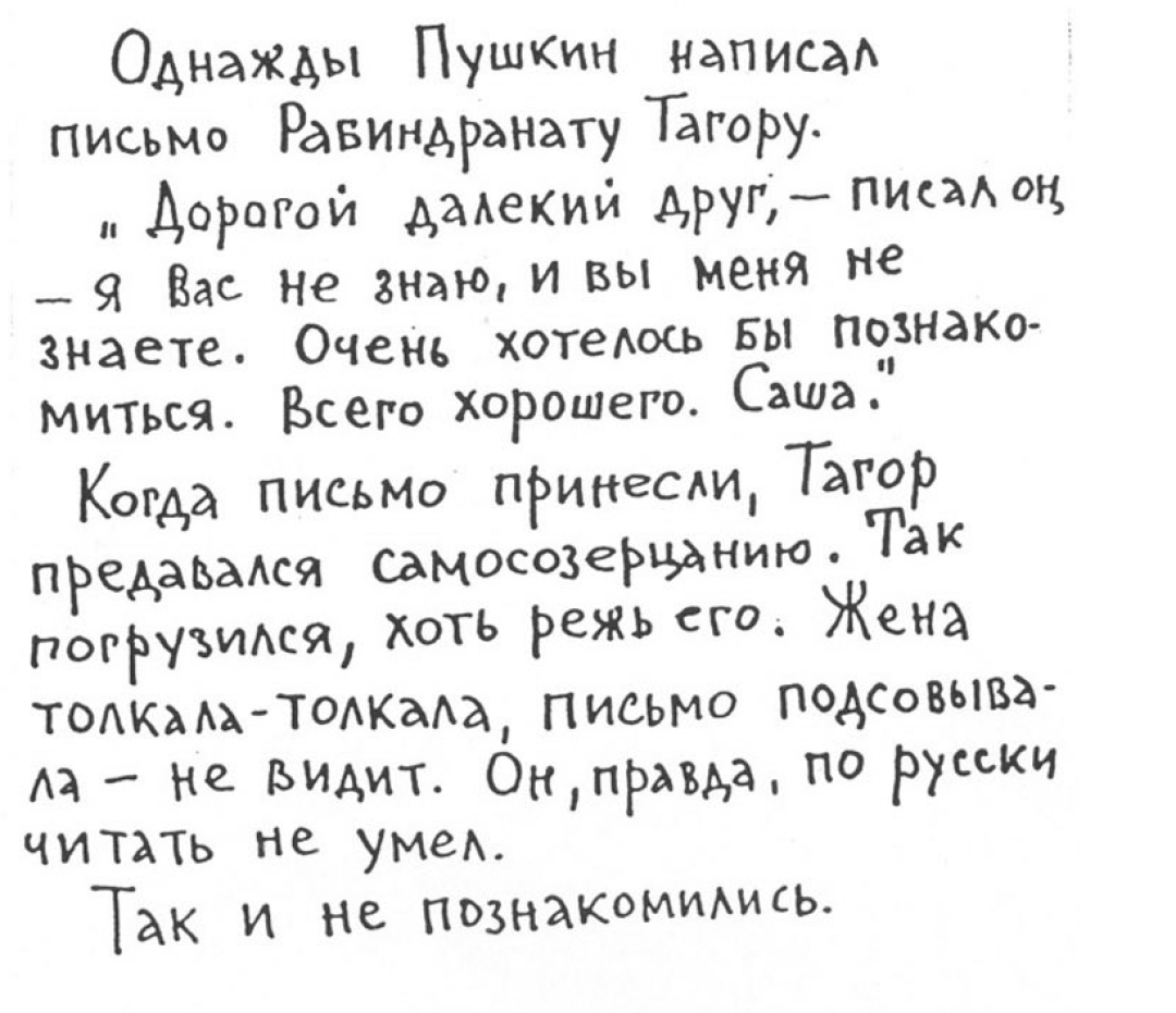 №5 Однажды Пушкин написал письмо Рабиндранату Тагору. “Дорогой далекий друг, — писал он, — Я Вас не знаю, и вы меня не знаете. Очень хотелось бы познакомиться. Всего хорошего. Саша”.