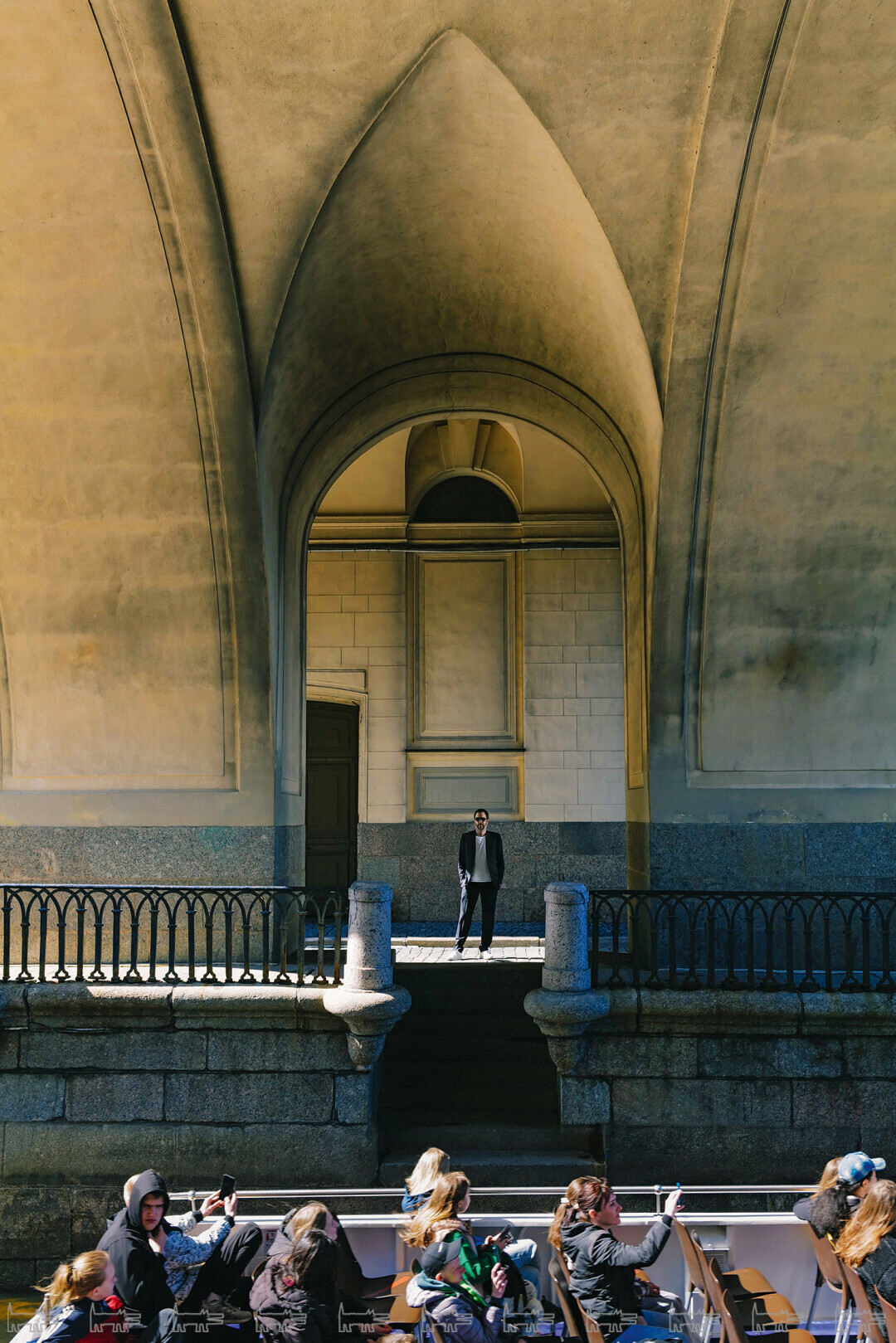 ![]() | Портик Нового Эрмитажа Александр сфотографирован у ног знаменитых атлантов, стоящих на постаментах из гранита-рапакиви и поддерживающих архитрав. Ученик Демут-Малиновского, скульптор Теребенев вдохновился фигурами древнегреческого храма Зевса Олимпийского в Акраганте на Сицилии, а 50 каменотесов работали над пятиметровыми гигантами в течение двух лет. |