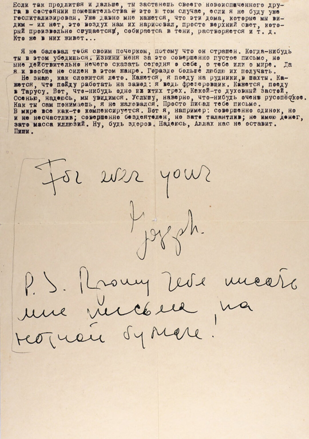 Письмо было написано поэтом в трагическом 1962 году — накануне суда и ареста. Лот происходит из частного собрания вдовы композитора Бориса Тищенко — арфистки и профессора петербургской консерватории Ирины Донской. Рассказываем о (субъективно!) самых интересных лотах в коллекцию.