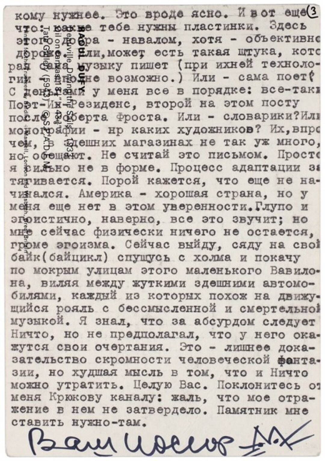 В торгах также примет участие машинописное письмо поэта на трех открытках с авторскими ручными пометками и рисунком кота, адресованное композитору Борису Тищенко в 1972 году. В нем Бродский рассказывает о переезде в Анн-Арбор спустя месяц после эмиграции из СССР: «Милый Боб, путешествие кончилось, и теперь, сочиняя эту открыточку, я сижу в своем кабинете в местном (Мичиганском) университете, смотрю на американский дождь и слушаю, как гудит эр-конишн». Сведения о письме впервые появились в монографии о Борисе Тищенко, написанной Ириной Донской: «А потом он написал уже из Америки, где окончательно поселился. Это большое письмо было напечатано на трех листах, вернее сказать, на их оборотах, поскольку каждый лист был копией акварели Рауля Дюфи (Raoul Dufe)». Лот представлен по стартовой цене 600 тысяч рублей.