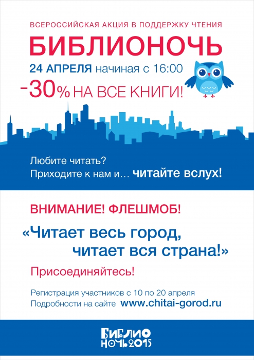24 апреля пройдет Всероссийская акция в поддержку чтения «Библионочь». В Год литературы она приобретет небывалый масштаб и объединит еще больше людей. Сеть книжных магазинов «Читай-город», постоянный партнер и участник акции, приготовила особую программу для книголюбов России – увлекательный флешмоб «Читает весь город, читает вся страна».