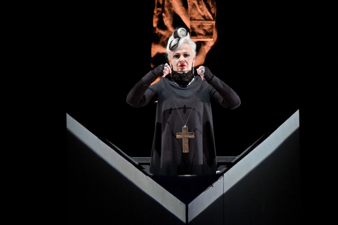 Острота и лаконичность сценографии – еще один уровень художественного языка, на котором режиссер говорит со зрителем. Трибуна, на который возвышается Судья, острым углом словно врезается в пространство. Молодые мужчины выстраиваются таким образом, что повторяют эту форму. Исполинских размеров крест из потрепанных, защитного цвета курток и шинелей. Экран, на котором в финале появляются лица безымянных жертв многочисленных репрессий. Интенсивные красный и черный цвета – символы революции и смерти.