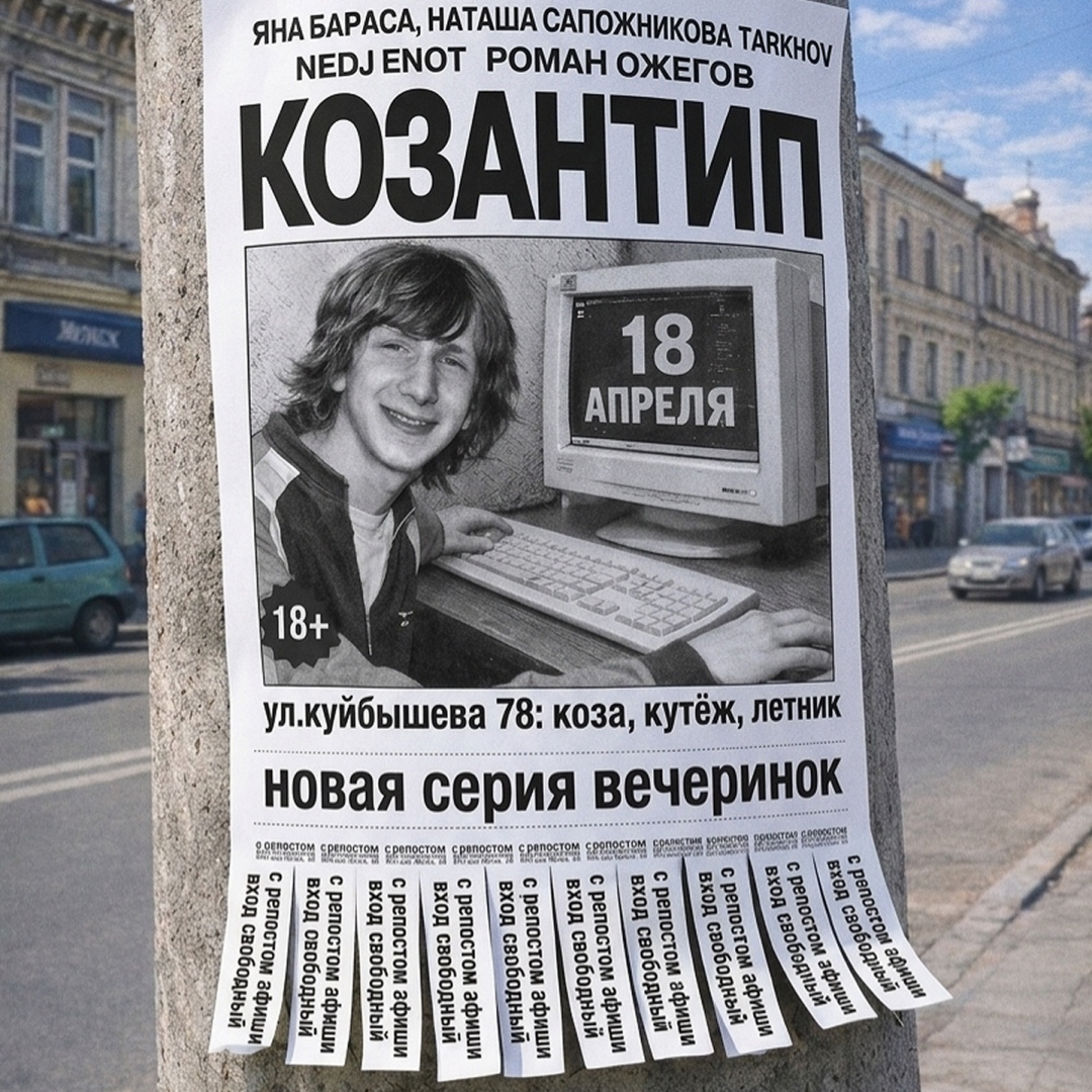Соскучившимся по клубной жизни (если вы понимаете, о чем мы!) приготовить сверхъяркие мини и кофты-сетки: завтра – 18 апреля – в семь вечера в «Козе» стартует серия вечеринок «Козантип 2026». Основной танцпол ищем в «Козе», секретную комнату – в «Кутеже», а летнюю площадку – прямо на улице Куйбышева.