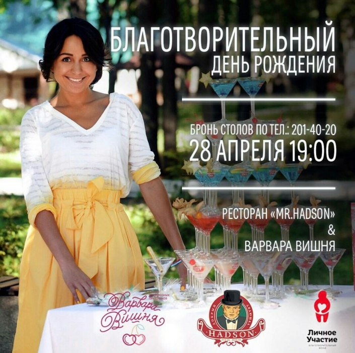 28 апреля - большой благотворительный День Рождения ресторана Mr.Hadson и Организатора Грандиозных Праздников Варвары Вишни. Организаторы предлагают не только шумно отпраздновать, но и поучаствовать в благотворительности. Часть вырученных средств в ресторане в этот день и все чаевые официантов будут переданы в фонд "Личное участие" в поддержку строительства детской спортивной площадки для Самарского Областного клинического противотуберкулезного диспансера им. Н.В. Постникова.