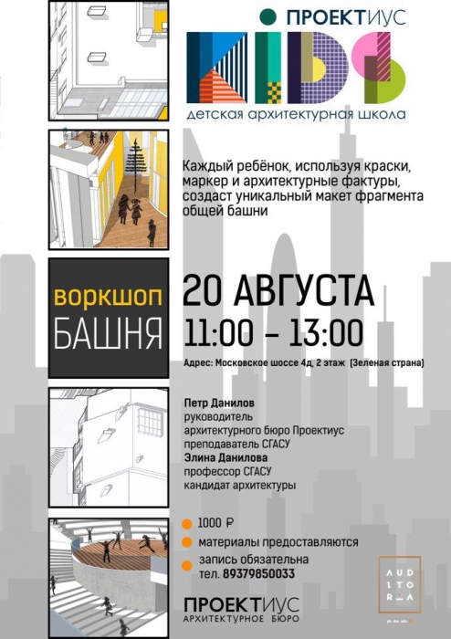На нем каждый ребенок создаст свой неповторимый макет - один фрагмент общего проекта башни или небоскреба. Дети будут использовать картон, маркеры и краски, а также распечатанные архитектурные фактуры. Абсолютно все материалы предоставляются, с собой ничего приносить не нужно. Детки познакомятся с техникой коллажа, будут совмещать нарисованные и вырезанные цветные элементы. У каждого ребенка получится настоящее произведение современного искусства, ведь чем люди младше, тем свободнее в творчестве! На воркшопе ребенку помогут раскрыться и творить, а не следовать образцам!