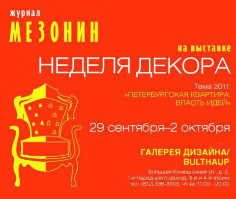 Неделя декора – ежегодный масштабный выставочный проект журнала «Мезонин», посвященный искусству создания интерьеров. Впервые выставка прошла в Москве в 2001г. В 2008 г. в рамках активного расширения географии распространения журнала «Мезонин» Неделя декора впервые состоялась в Санкт-Петербурге.