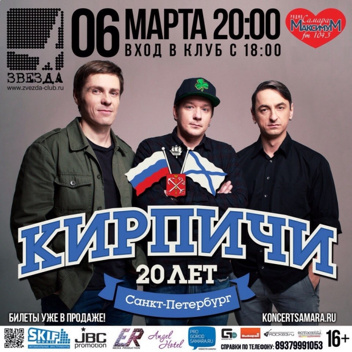 6 марта, ждите «Кирпичей» в Самаре! В программе Юбилейного концерта в клубе «Звезда» будут все самые лучшие песни за 20-летнюю историю группы!