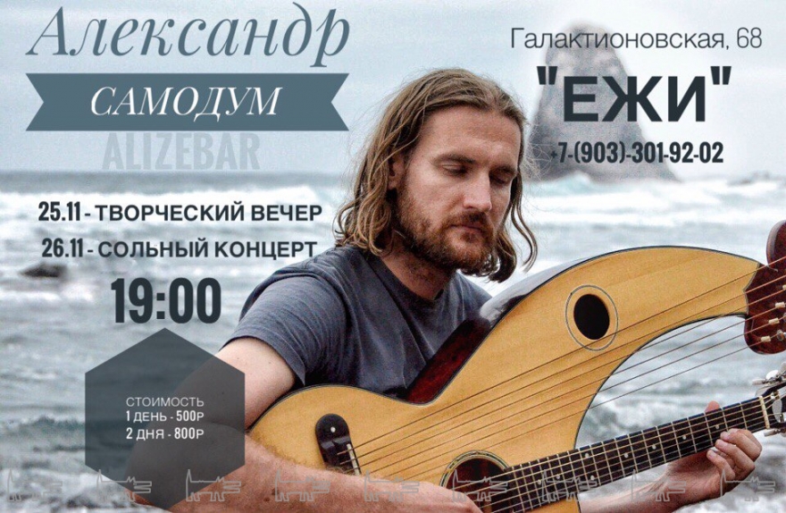 Вы что-нибудь знаете про арфогитару? А удавалось услышать, как звучит этот загадочный инструмент? И последний вопрос: вы знаете, что за удивительные люди играют на нем? Эко-ресторан «ЕЖИ» даст ответы: в пятницу в 19.00 пройдет творческий вечер-перфоманс Александра Самодума, профессионала игры на арфогитаре. А вечером субботы он даст сольный концерт – хороший повод расширить горизонты кругозора и восприятия.