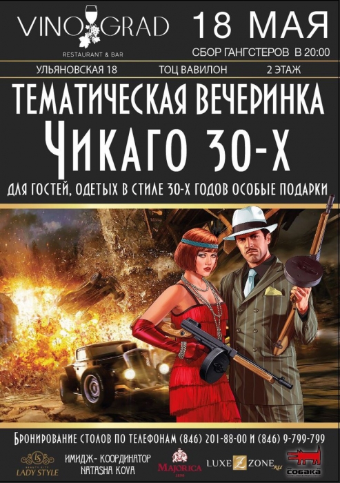 США 30-х годов - эпоха гангстеров, воплощенная во многих фильмах. Ресторан Vinograd предлагает на один вечер погрузиться в ту опасную и притягивающую атмосферу и устраивает тематическую вечеринку "Чикаго 30-х" годов".