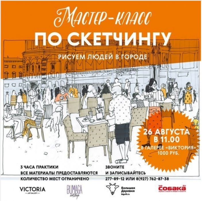 Все материалы предоставляются и входят в стоимость мастер-класса (1000 рублей). Занятие пройдет с 11.00 до 14.00 и будет состоять из 2х блоков (теоретического в галерее и практического на набережной или в городском кафе).