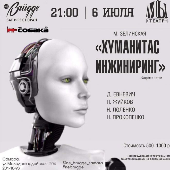 Ресторан "Не Brügge" спешит порадовать любителей читок - 6 июля совместно с творческим союзом "Мы - Театр" состоится читка пьесы М. Зелинской "Хуманитас Инжиниринг".