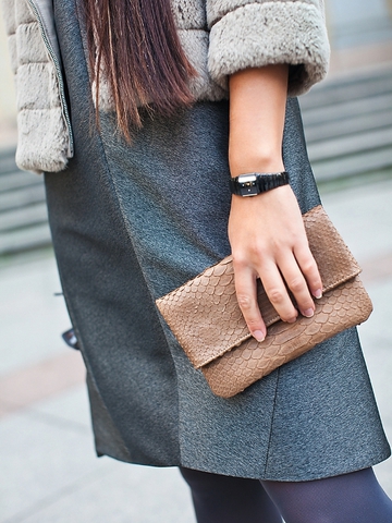 На Евгении: платье Ann Demeulemeester, шуба и очки JNBY, обувь неизвестной марки куплена на развалах, часы Rado, кольцо Piaget, клатч из кожи питона из Индонезии.