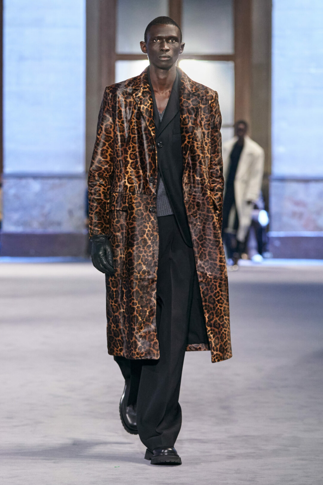В коллекцию Ami осень-зима 2022 вошли платья, брючные костюмы (у женщин были брюки с заниженной талией), мини-юбки, комбинезоны, пальто, дубленки и шубы. Одним из заметных элементов мужских образов стало боа, а женских — объемные рукава из перьев. Среди принтов главенствует леопард, а цветовая палитра коллекции состоит из розового, красного, оранжевого, зеленого, фиолетового, а также черного, коричневого и белого.