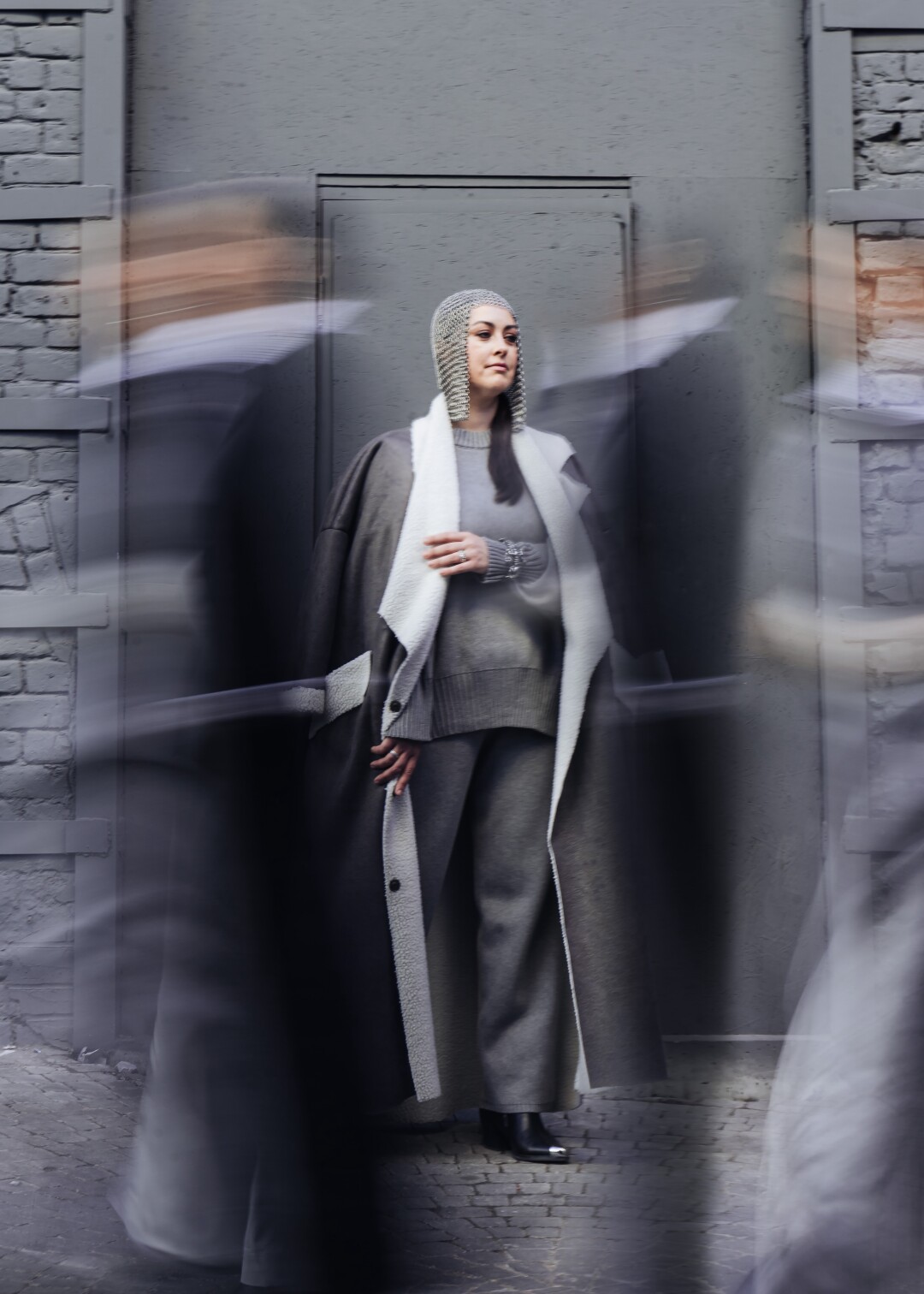 У бренда OLAMARIN множество элементов, которые, как конструктор, можно собирать в единый образ. Я бы особенно отметила ее драпированные жилеты, сделанные как будто из гофрированной бумаги. Они были представлены в нашем пространстве, их отмечали многие модники города за архитектурность и графичность форм, возможность создания красивых комплектов как с базовыми изделиями из линейки OLAMARIN, так и с вещами от других брендов.