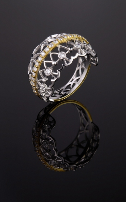 В узор шантильи вшиты тридцать бриллиантов круглой огранки общим весом почти полкарата.