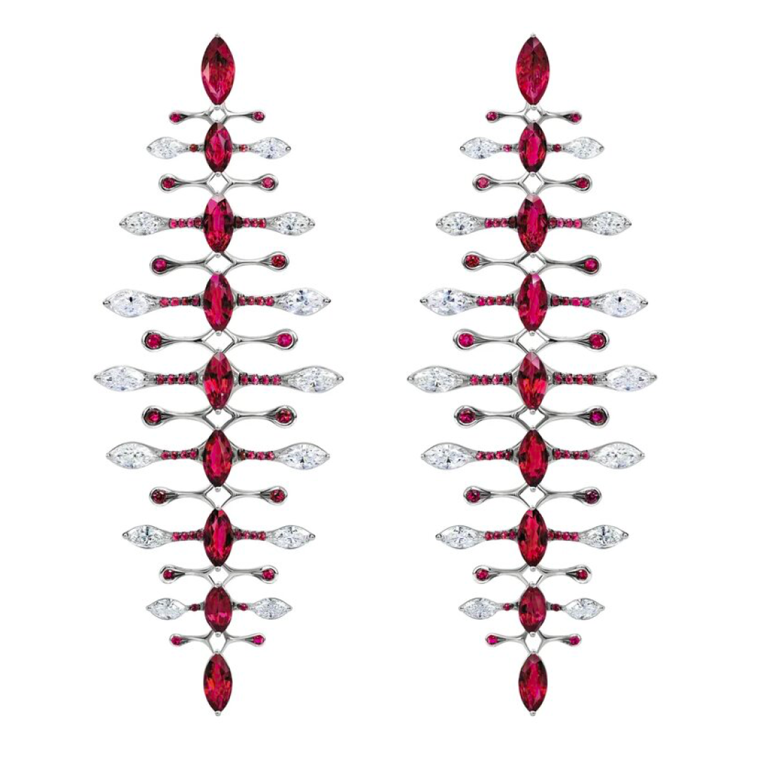 Абстракционистские серьги из белого золота, если вглядеться, сложены из камней классических огранок — рубиновых и бриллиантовых маркизов и кругов. Цветные камни весят 14,3 карата, прозрачные — 5,3.
