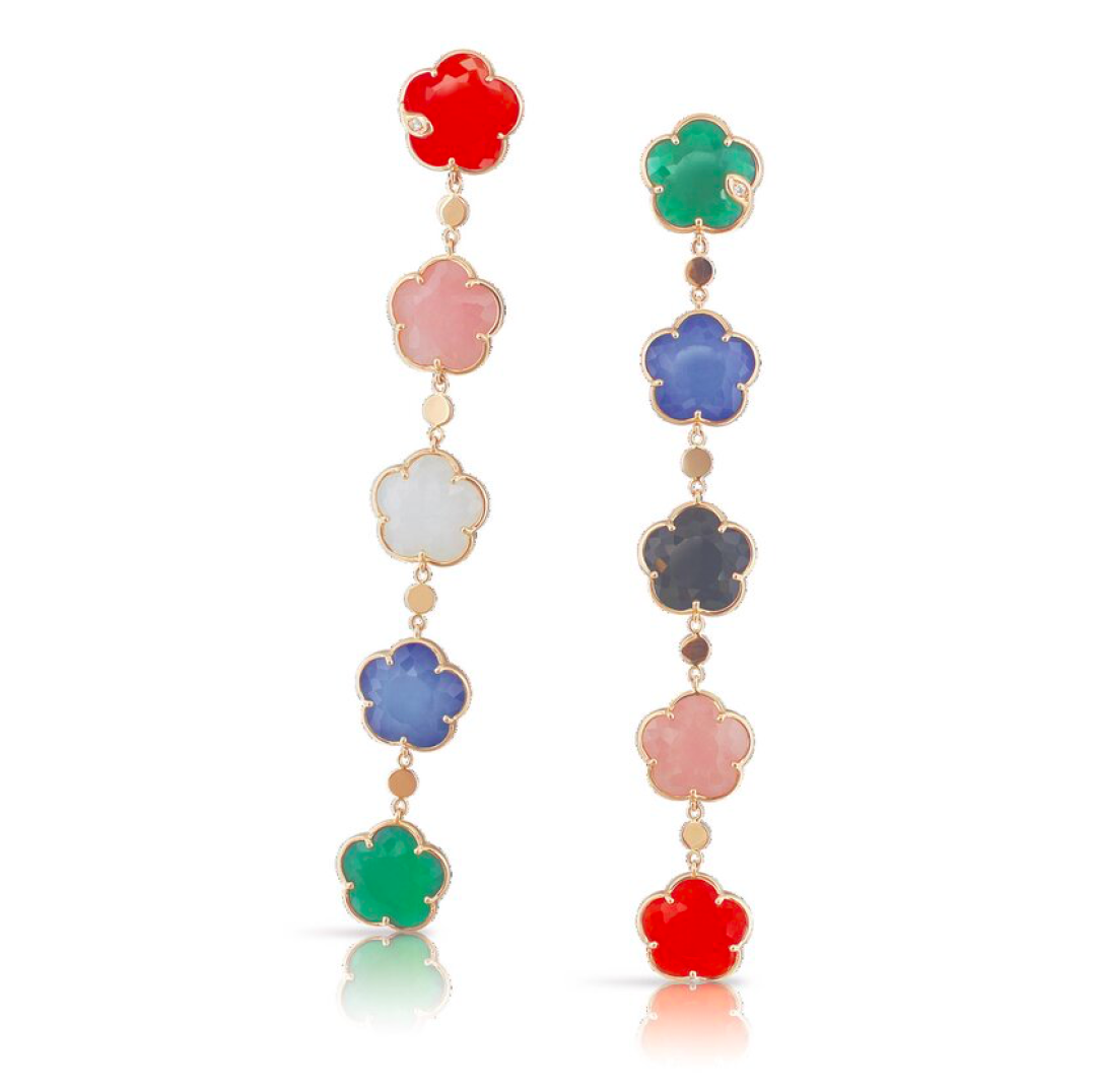 На звенья розового золота нанизаны агаты, халцедоны, карнелианы, ониксы и лазуриты в форме придуманного креативным директором марки Эудженией Бруни пятилепесткового цветка.