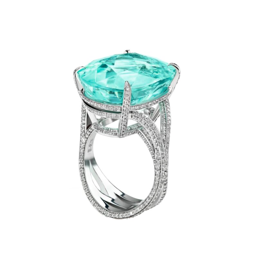 Петербургские ювелиры помогли Ксении Собчак создать эскиз совершенно нескромного коктейльного кольца. Огромный, почти в 24 карата, камень из редеющих аукционных запасов турмалина параиба (на бразильской шахте минерал не добывают уже больше десяти лет) огранен овалом и поднят на своды из белого золота. Поддерживают этот небесный портал четыре хищных клыка-крапана с бриллиантовой инкрустацией.