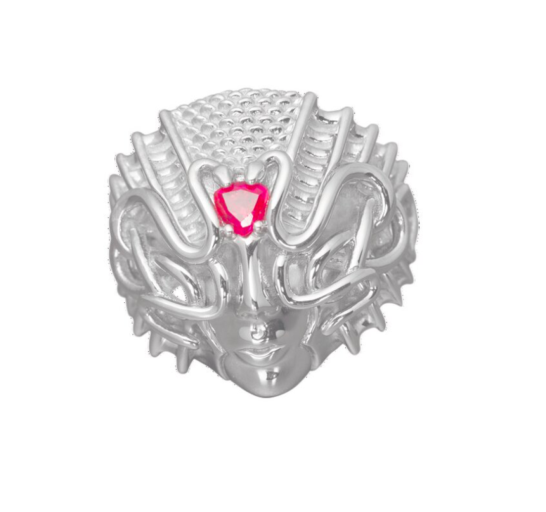 Юный российский бренд изящно переплавляет мифы Древней Греции: серебряным кольцом с рубином стала голова то ли Медузы, то ли слепой Фемиды.