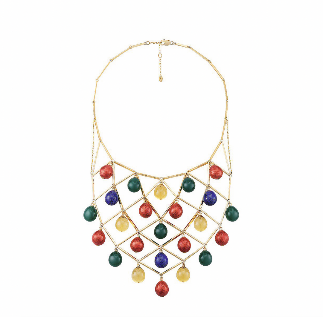 Нанизав на сеть из позолоченного серебра лазуриты, зеленые агаты и цитрины, Петру Аксенову удалось повторить палитру райского сада с полотен Брейгеля — и все это в одном ожерелье!