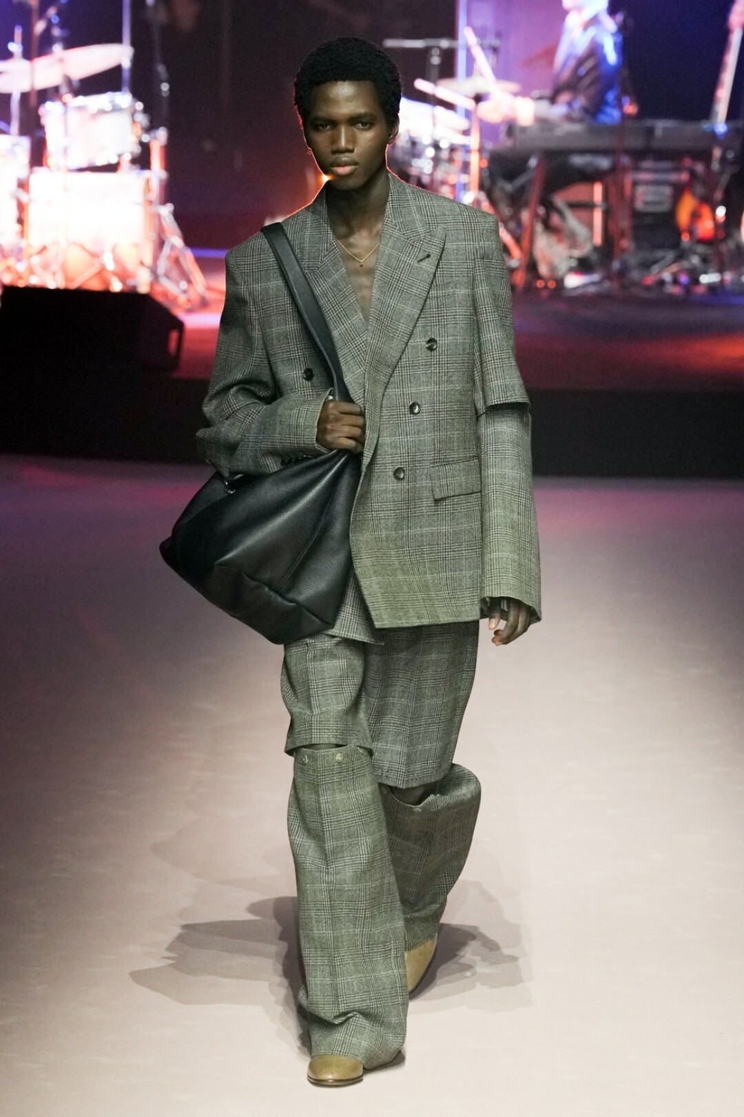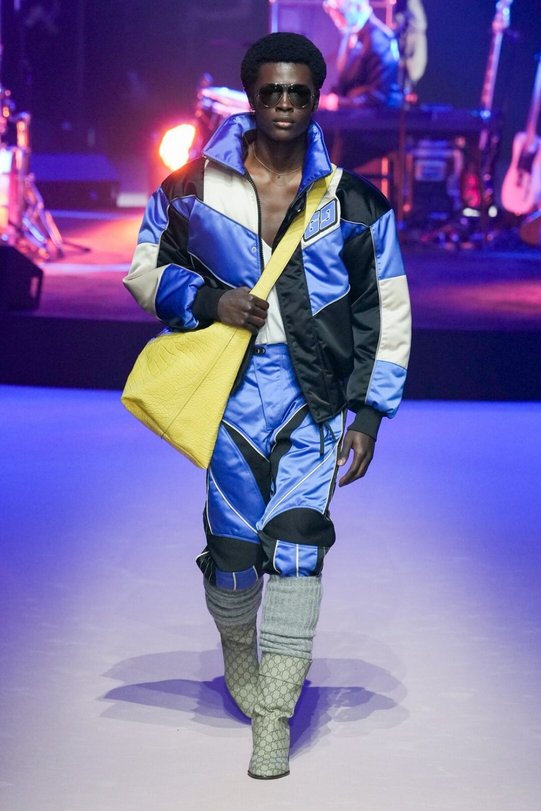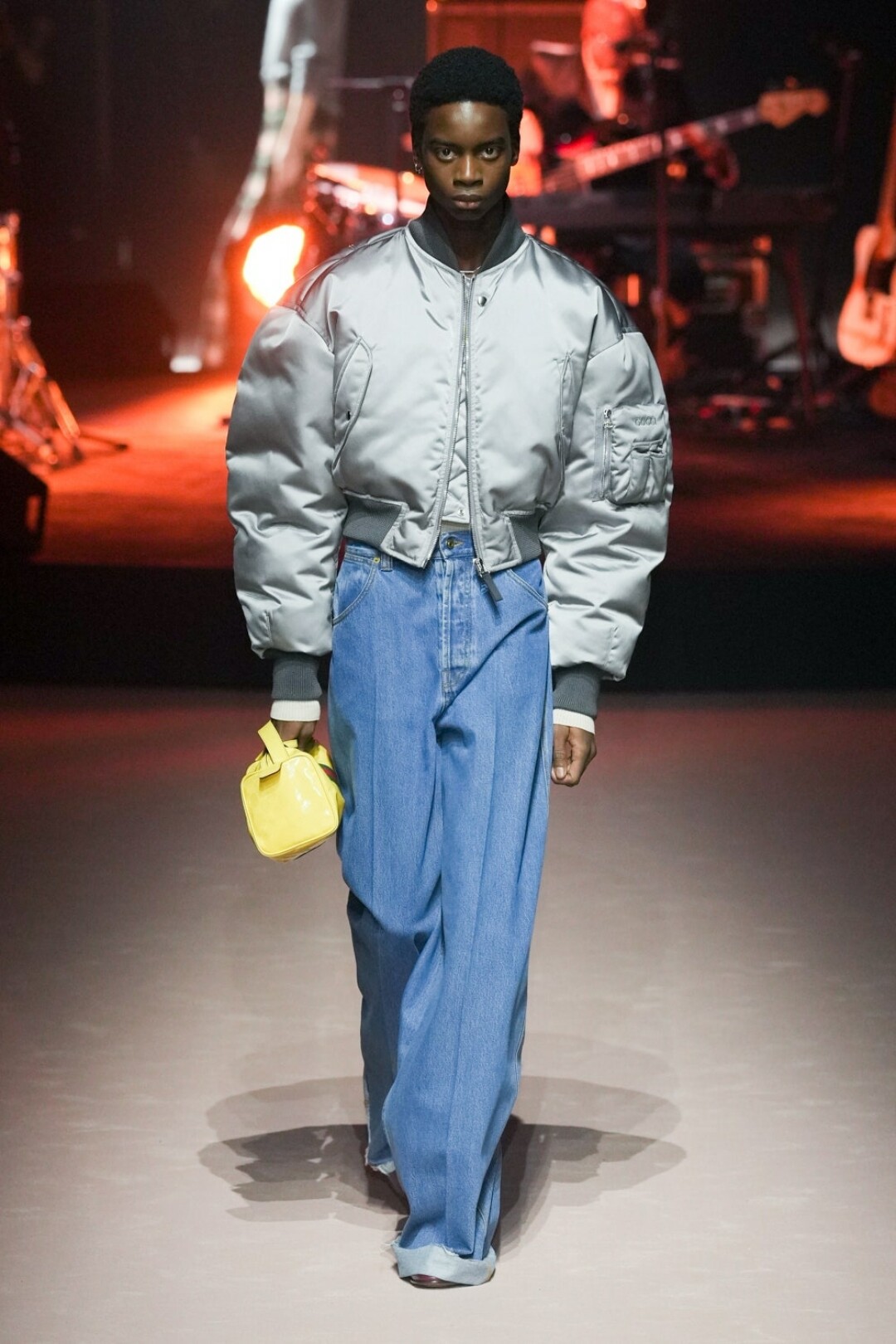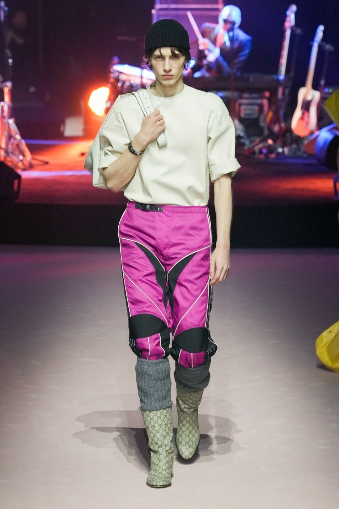 Мужчина больше не уйдет из Gucci весь в кружевах и пайетках, теперь его удел – стальные бомберы без затей и пиджаки оверсайз нейтральных оттенков. А также брюки, джинсы и белые майки: а вдруг он не слышал про масс-маркет. Последний неловкий привет от Алессандро шлют опростившиеся шифоновые блузы, лаковые брюки (с пикантными розовыми сапожками) и разноцветные мото-штаны (в бабушкиных гетрах). И вот мы снова в той точке, в которой в Gucci ходят разве что за сумками (выкинули леопардовые!).
