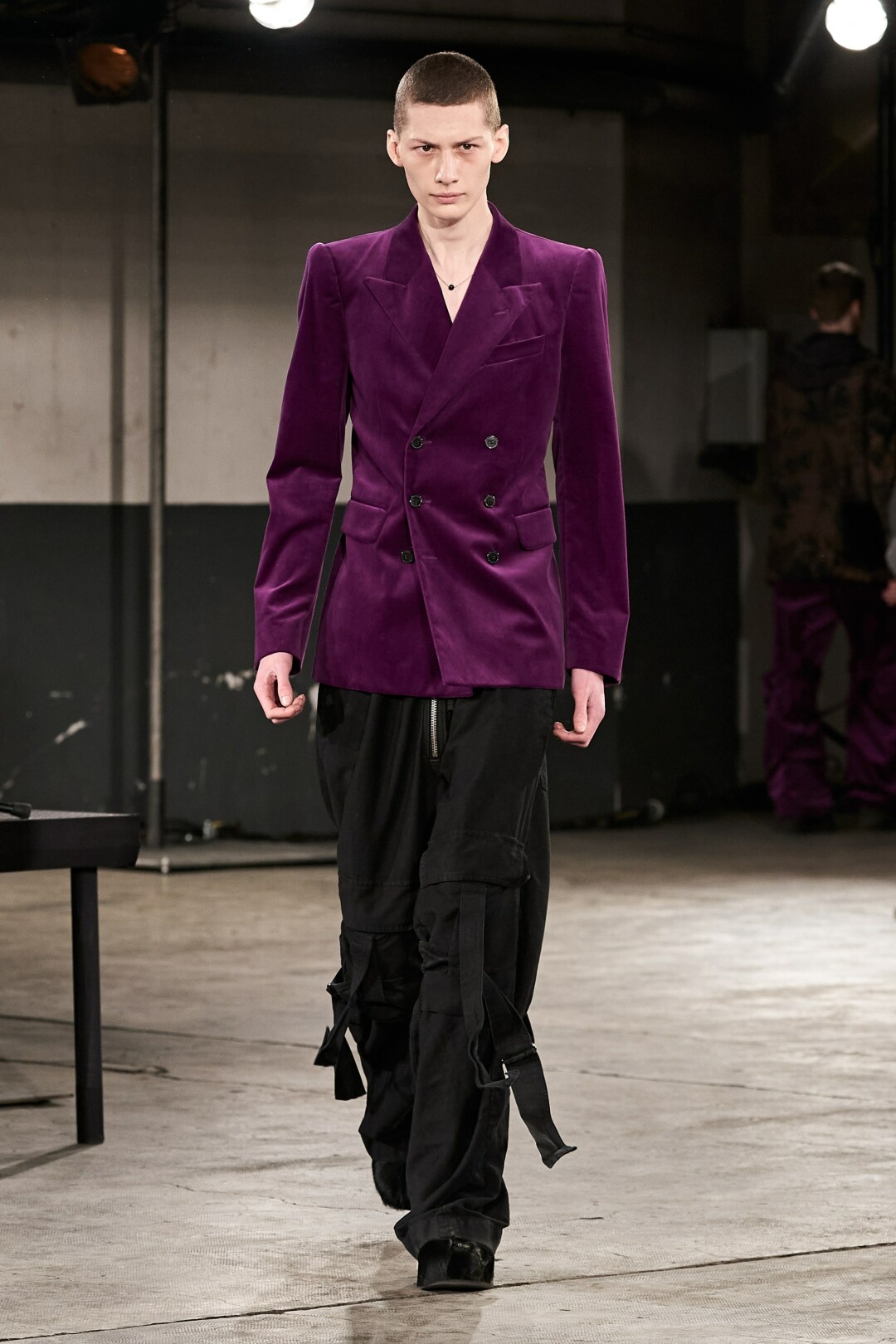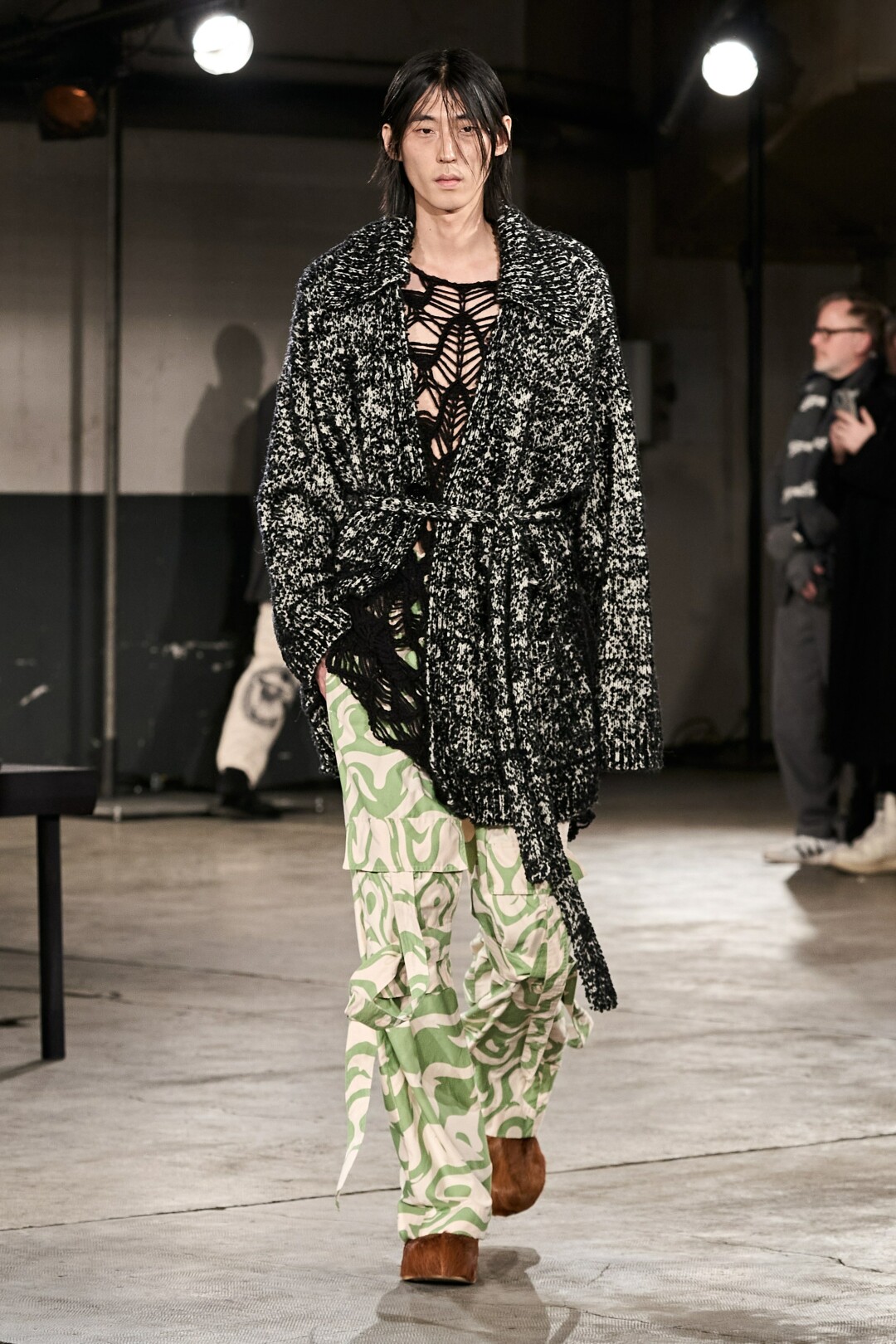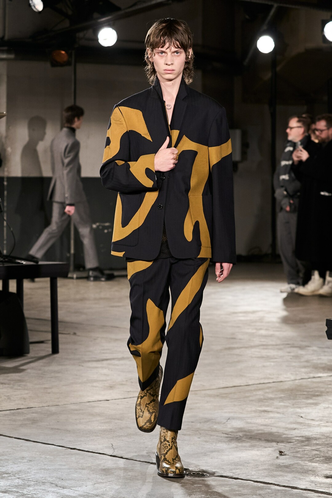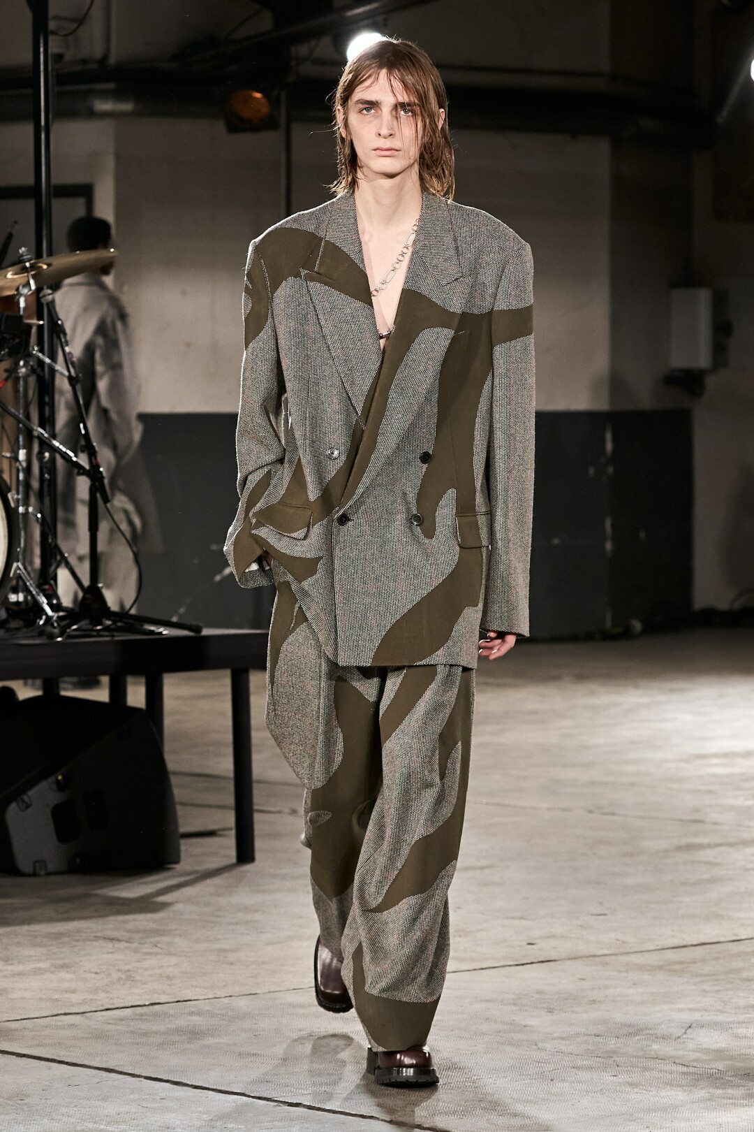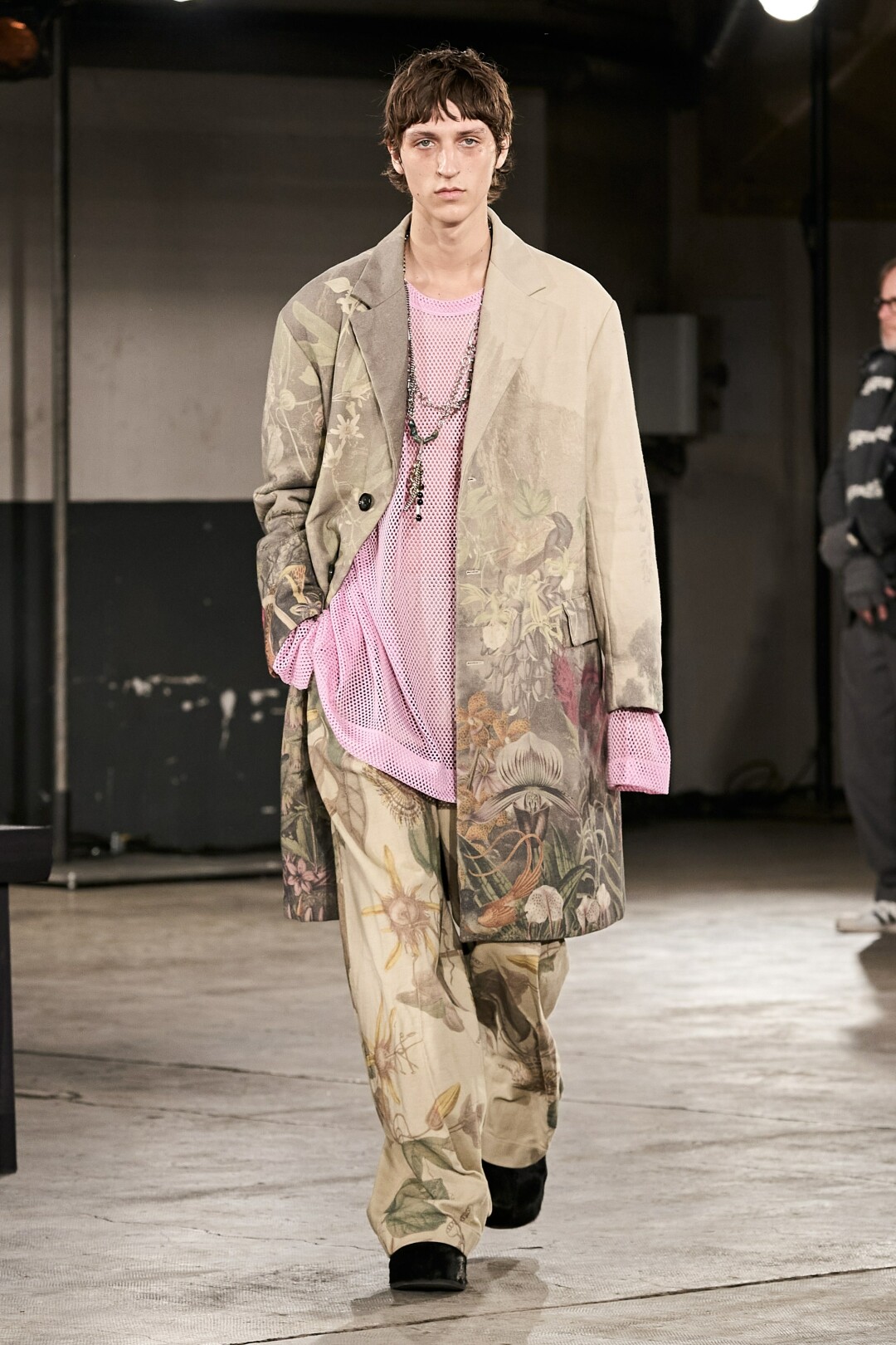 Все началось, как и в женском показе SS23, с черного квадрата (читать — структурированного пальто), который в процессе отправился в галлюциногенный трип, а в финале и вовсе расцвел. Словом: техно в оранжерее! Двубортные пиджаки, которые появляются чуть ли не в каждой мужской коллекции дизайнера, стали бархатными, узоры на костюмах-двойках превратились в художественные вихри, а о присущей Дрису ранимости напомнили розовые карго и кофты-паутинки, которые будто связала ваша бабушка.