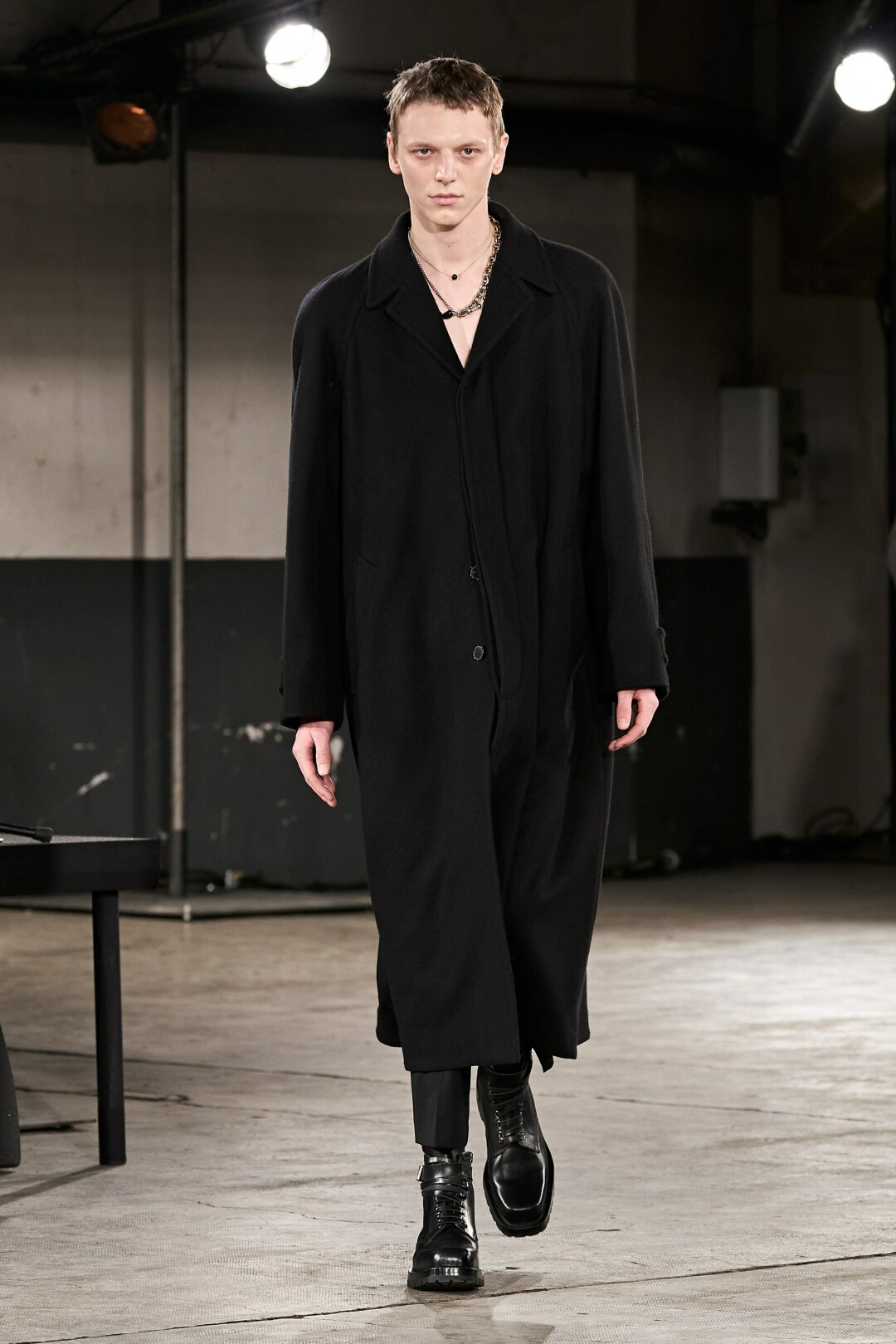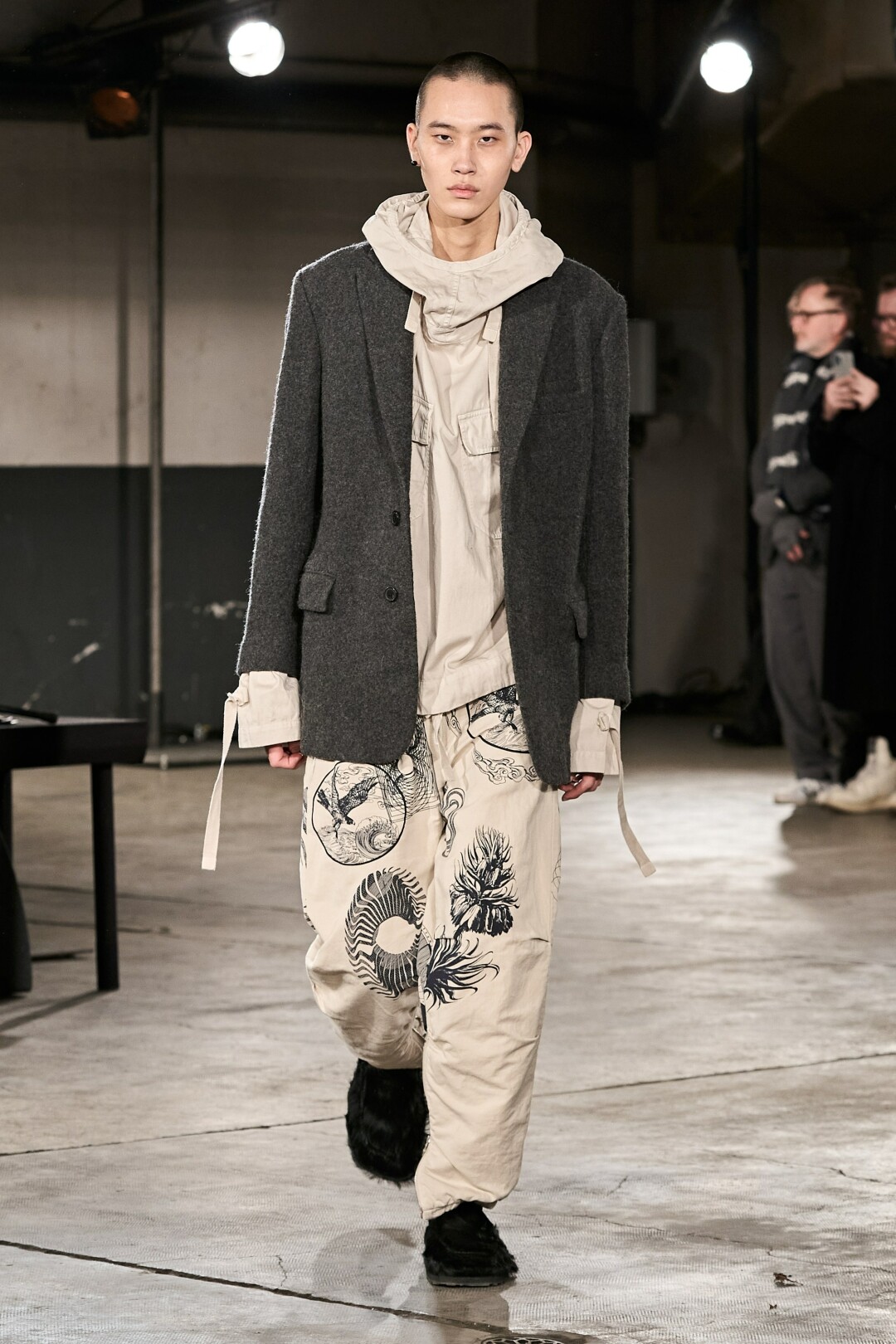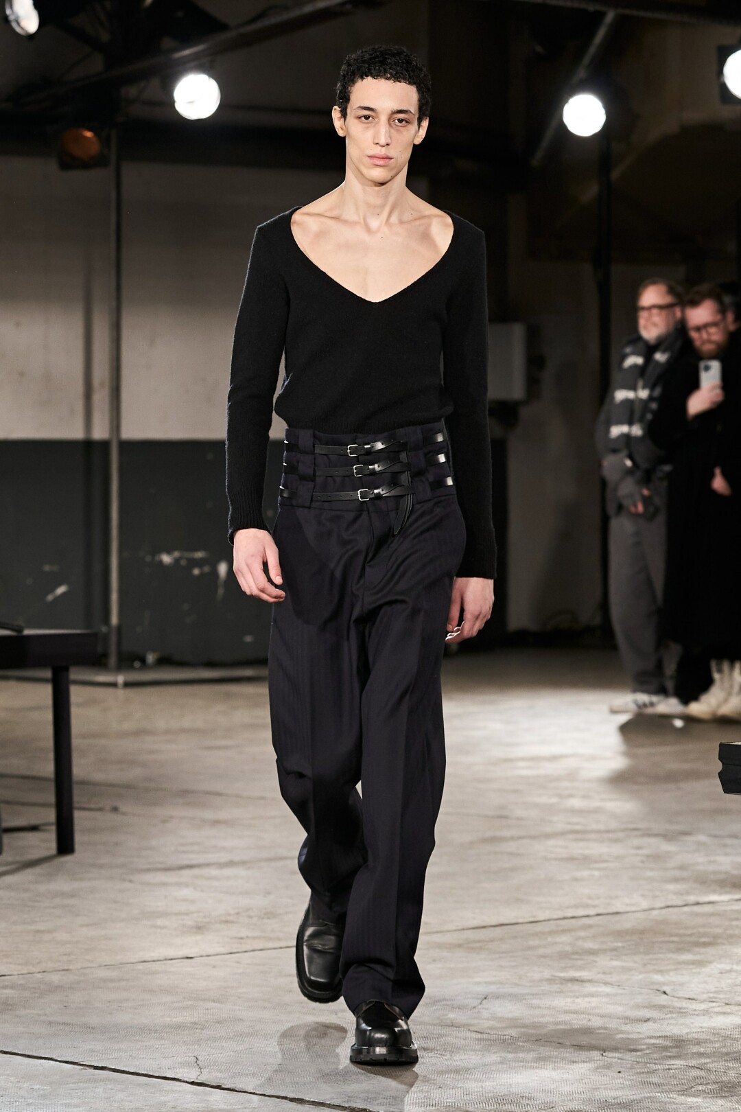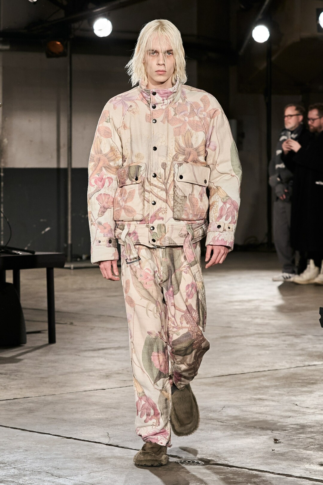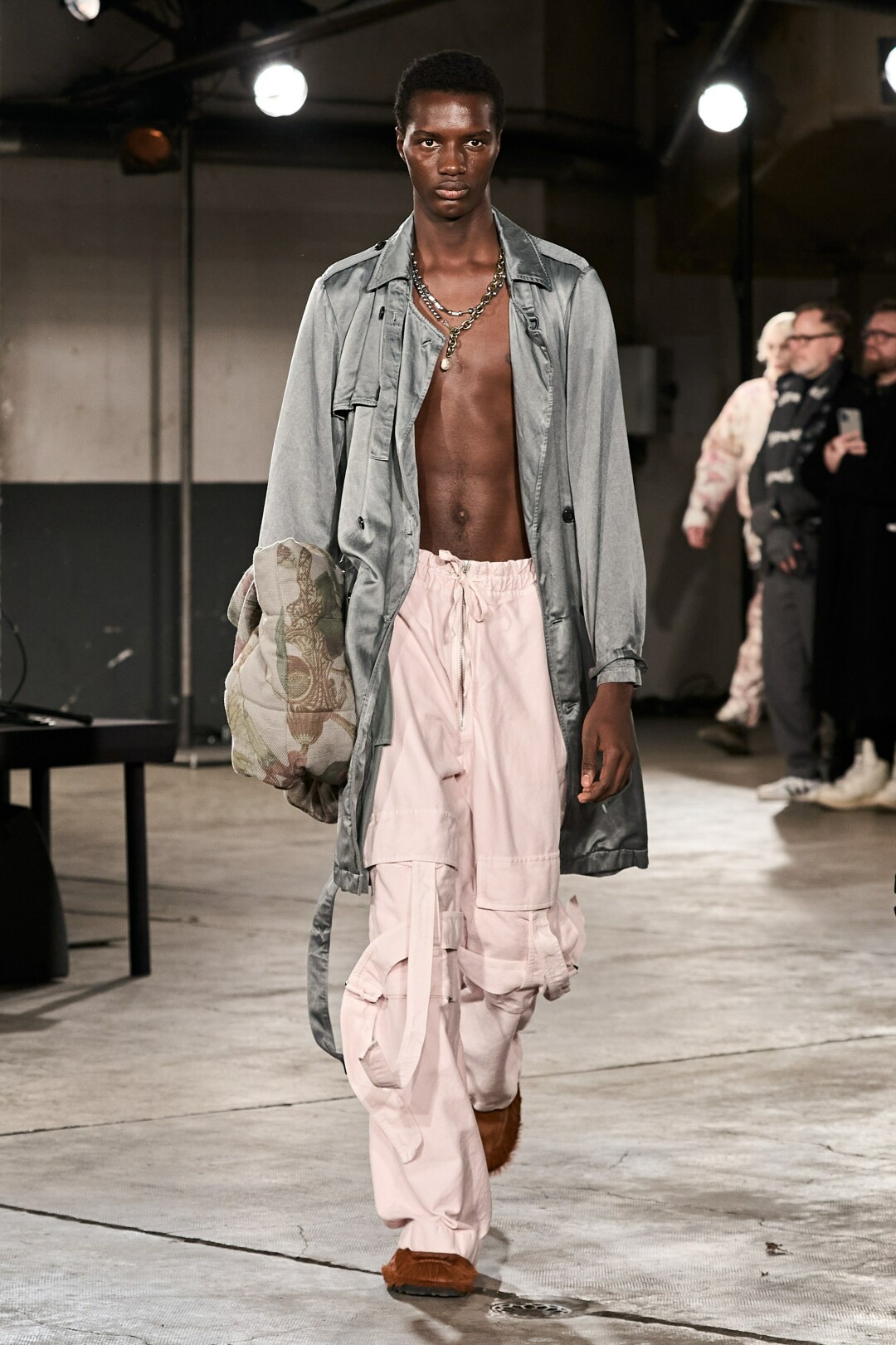 Все началось, как и в женском показе SS23, с черного квадрата (читать — структурированного пальто), который в процессе отправился в галлюциногенный трип, а в финале и вовсе расцвел. Словом: техно в оранжерее! Двубортные пиджаки, которые появляются чуть ли не в каждой мужской коллекции дизайнера, стали бархатными, узоры на костюмах-двойках превратились в художественные вихри, а о присущей Дрису ранимости напомнили розовые карго и кофты-паутинки, которые будто связала ваша бабушка.
