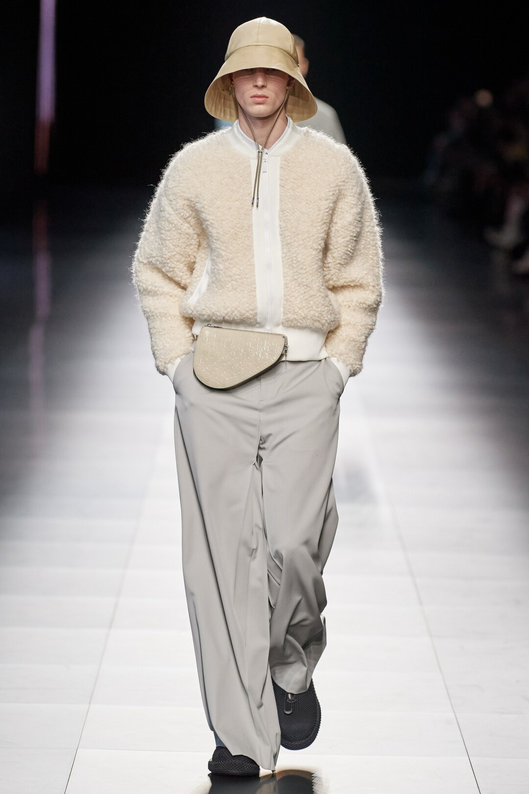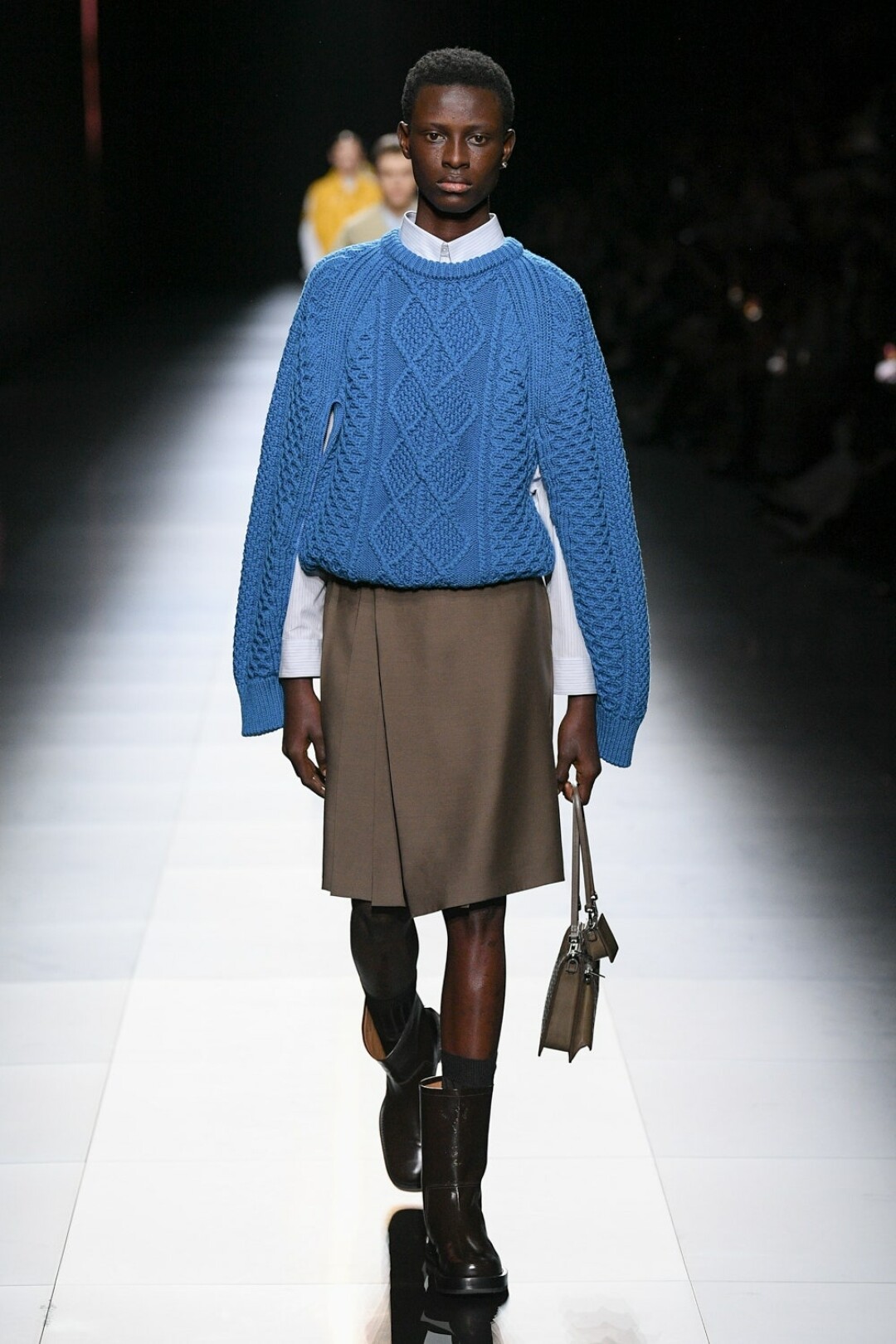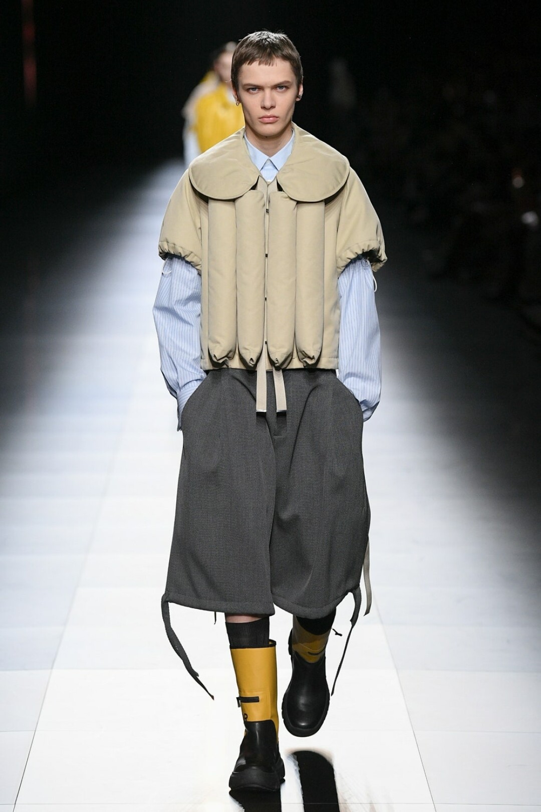 Вначале была сирень, но это у Элиота: у Кима Джонса на ее месте ландыши, любимые цветы Кристиана Диора и один из символов Дома, истории которого дизайнер и посвятил коллекцию. От Диора – все оттенки серого, от Ива Сен-Лорана – отдельный леопардовый привет. Лучшее от самого Джонса – филигранно подвернутые пиджаки, летящие шифоновые ленты, юбки-шорты и неистощимые фокусы с рукавами. Но вернемся к Элиоту, чья "Бесплодная земля" – в том числе и трактовка мифа о короле-рыбаке. Из традиционного костюма английских рыбаков здесь пол мудборда: от панам до аранских свитеров, от непромокаемых плащей до спасательных жилетов.