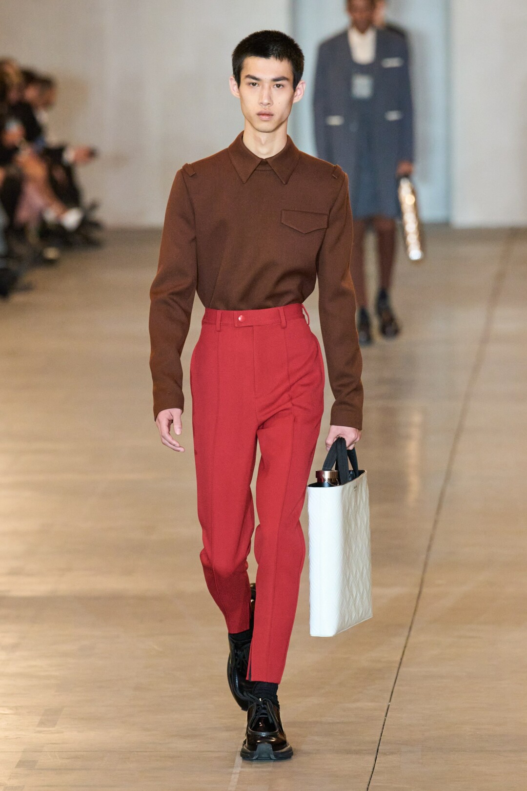 Мы любим Prada за уверенные сочетания и тут им нет равных: красные брюки и шоколадный джемпер в ансамбле с белым тоутом-флягой из металлического листа, насыщенный голубой жакет и мятная сумка, кэмэл с мандариновыми вставкам на рукавах. Завершили показ удлиненные костюмы-двойки из замши: к весне ждем на улицах мягких ворсистых мужчин.