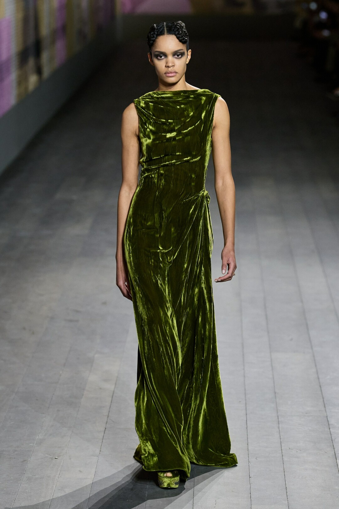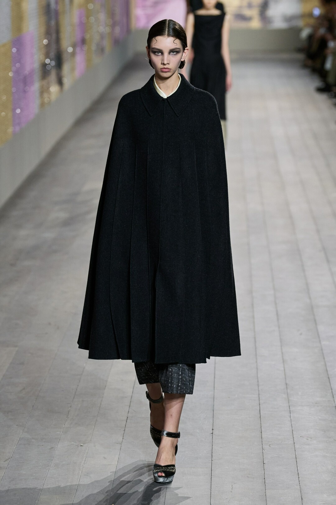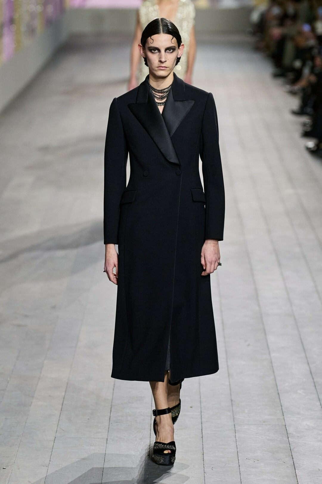 Скромный дневной кутюр по версии Christian Dior это преимущественно двубортные костюмы нейтральных оттенков, лучше серые, с юбкой миди, в лучших традициях основателя Дома. Или хотя бы благопристойное пальто поверх атласного боди или шелковой комбинации (прикройтесь!). Вечерний блок играл всеми оттенками драгметаллов и фактурами бархатных портьер, но среди этого умеренного блеска по-настоящему светилось идеальное черное пальто-смокинг. Чему еще нас учит эта коллекция? Что хоть на день, хоть на вечер мода и синьора Кьюри в частности пока что так и не изобрели ничего настолько же шикарного как кейп.