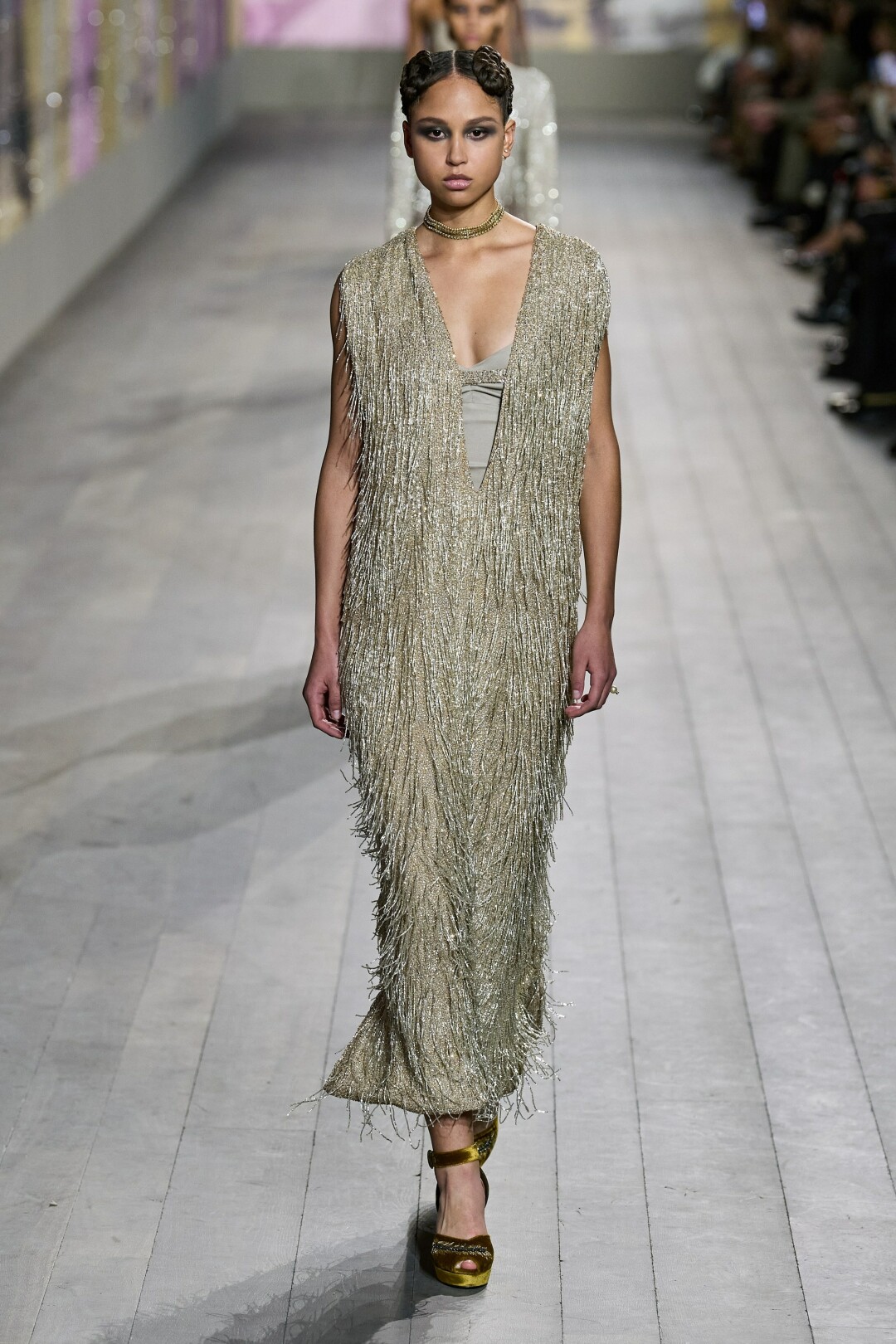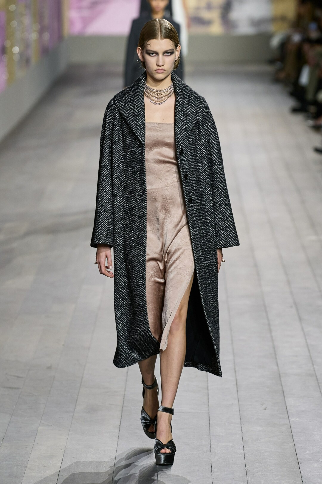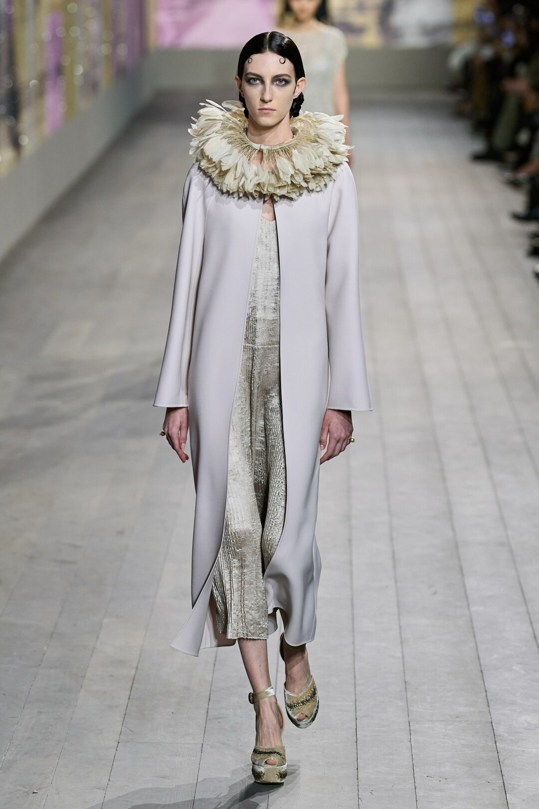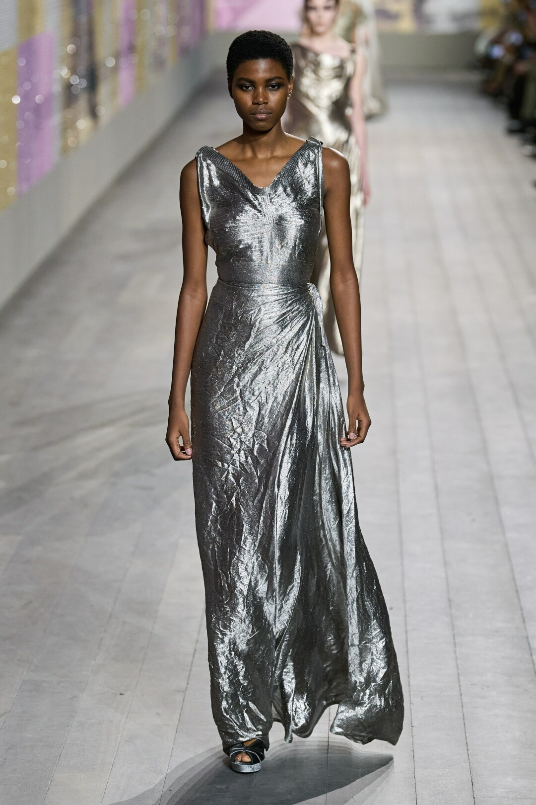 Скромный дневной кутюр по версии Christian Dior это преимущественно двубортные костюмы нейтральных оттенков, лучше серые, с юбкой миди, в лучших традициях основателя Дома. Или хотя бы благопристойное пальто поверх атласного боди или шелковой комбинации (прикройтесь!). Вечерний блок играл всеми оттенками драгметаллов и фактурами бархатных портьер, но среди этого умеренного блеска по-настоящему светилось идеальное черное пальто-смокинг. Чему еще нас учит эта коллекция? Что хоть на день, хоть на вечер мода и синьора Кьюри в частности пока что так и не изобрели ничего настолько же шикарного как кейп.