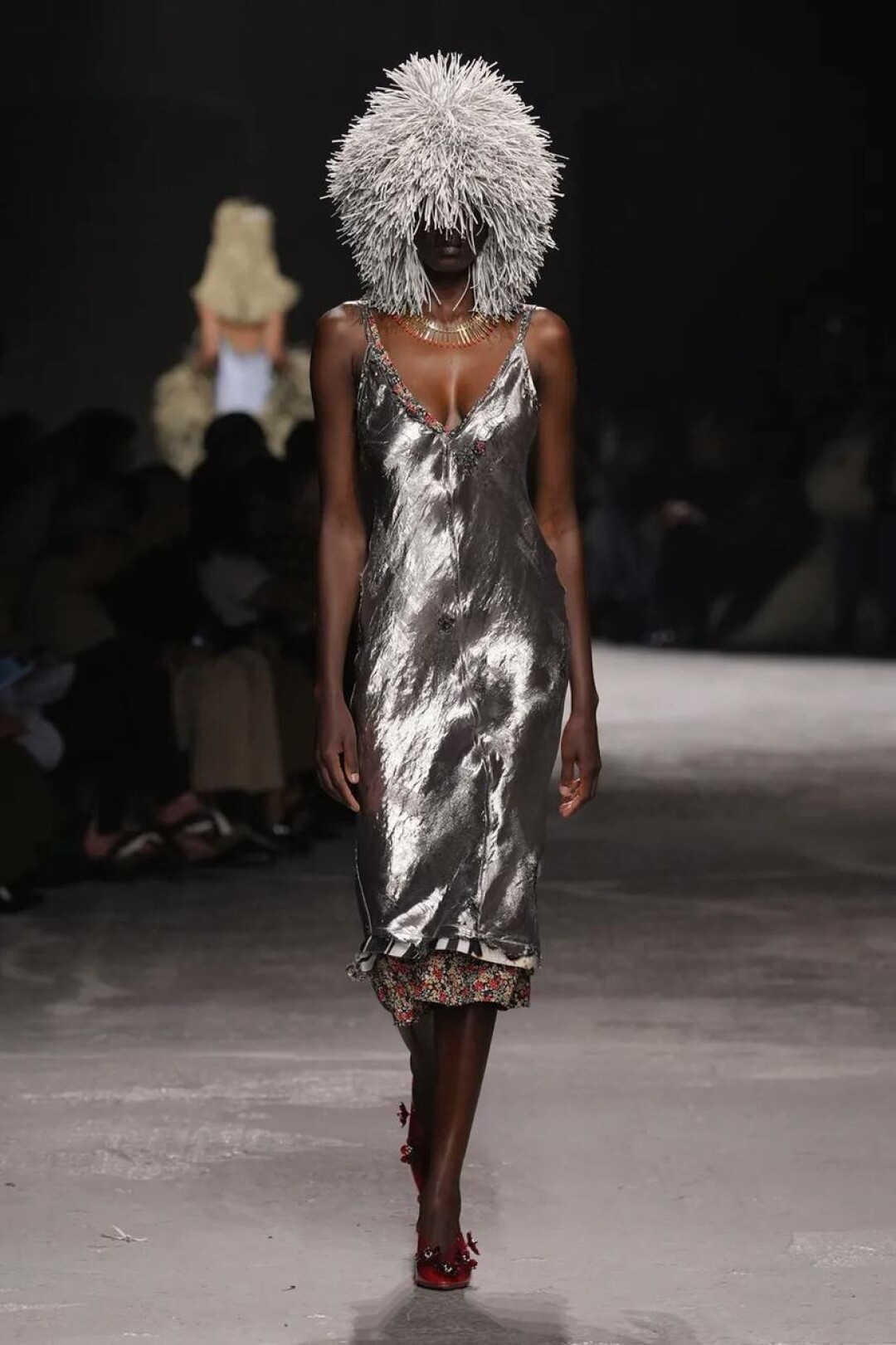 Запасаемся комбинациями с металлическим отливом, кожаными пальто со сложносочиненными воротничками и забавными кидкорными аксессуарами: от пряжек-кроликов и лягушек-брошей до плетеных колорблок-рюкзаков. Фиксируем тренд на приталенные жакеты-рубашки, градиентные принты и вещи из жатой ткани, а также практикуем даблбэггинг при помощи футляра для цветов и пластикового пакета-авоськи (Марианнакор!).