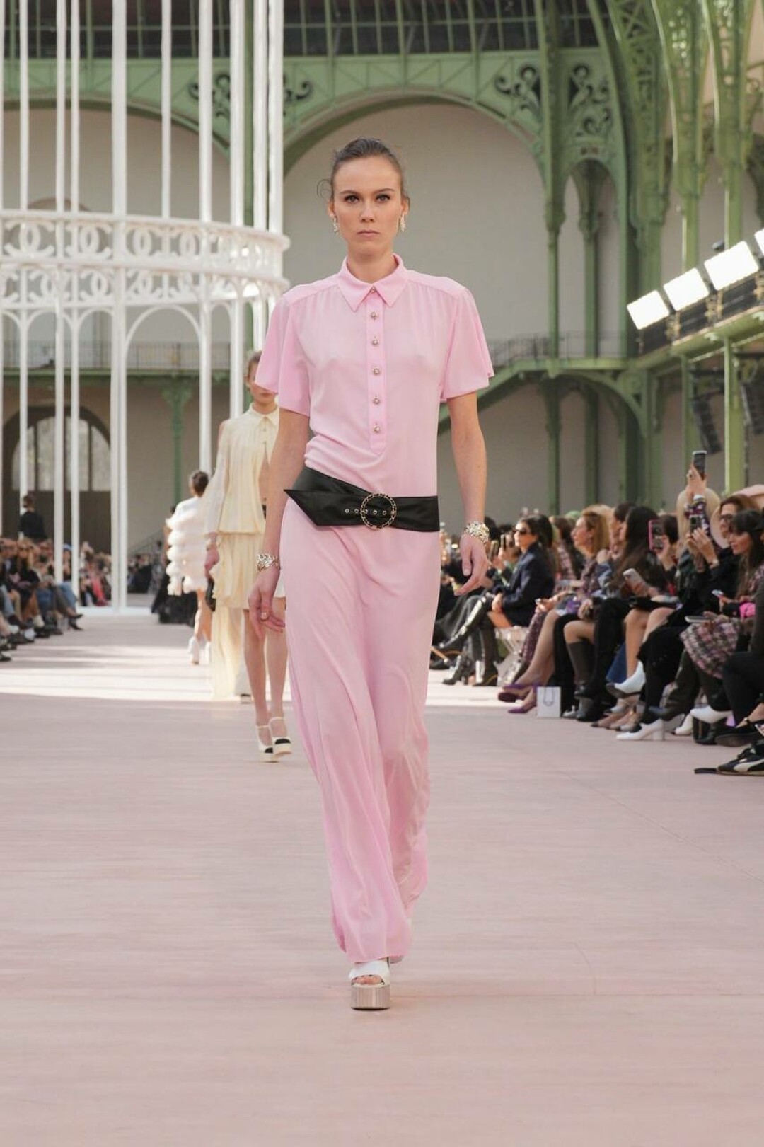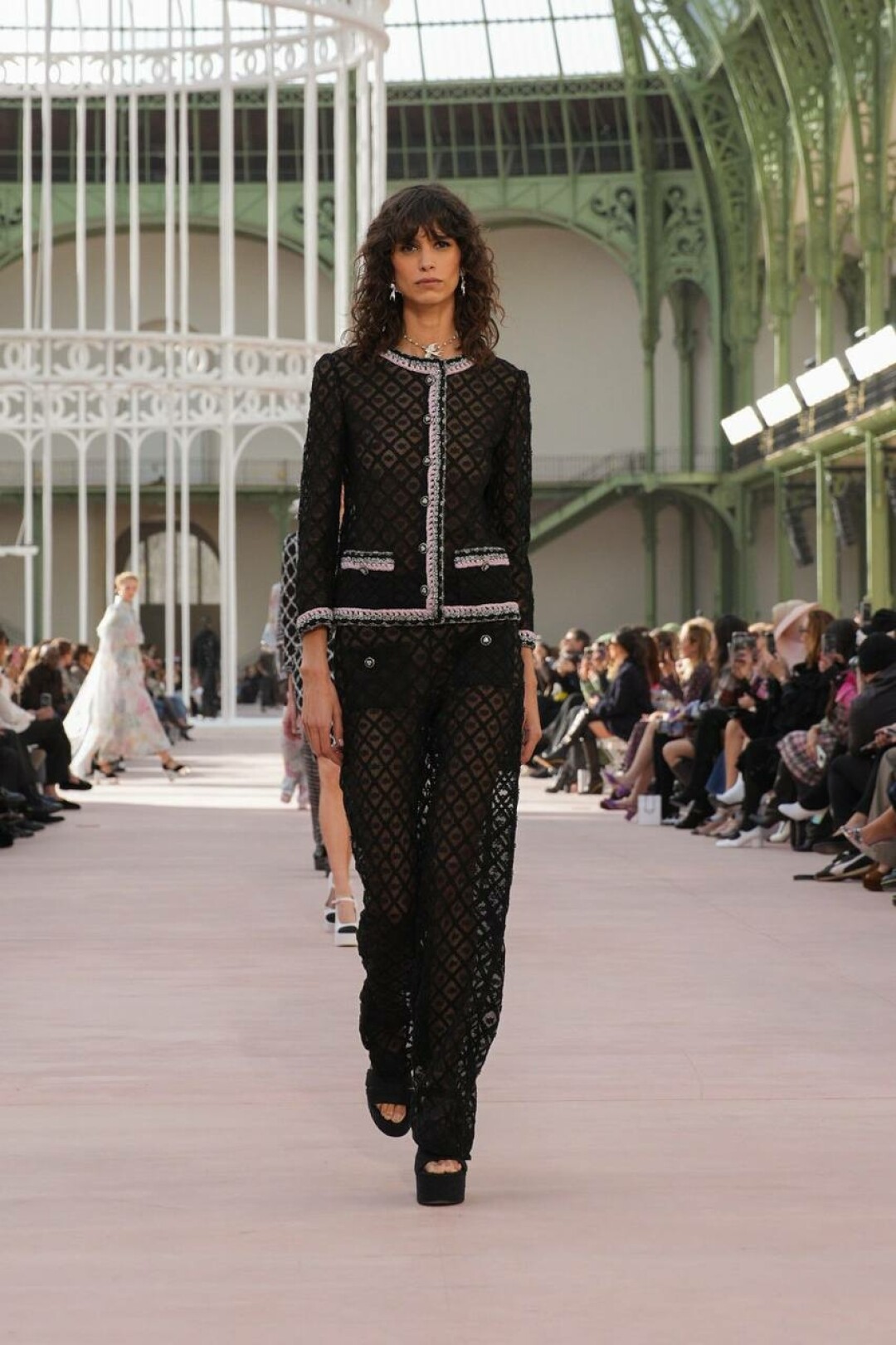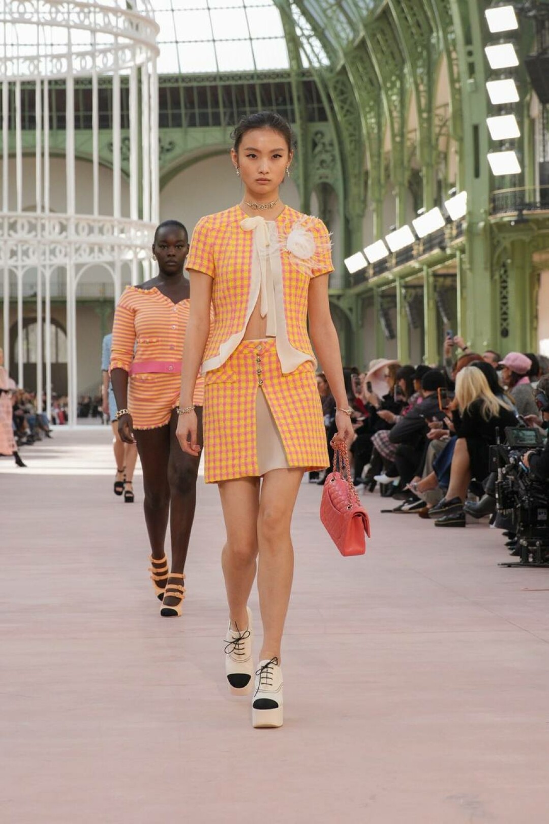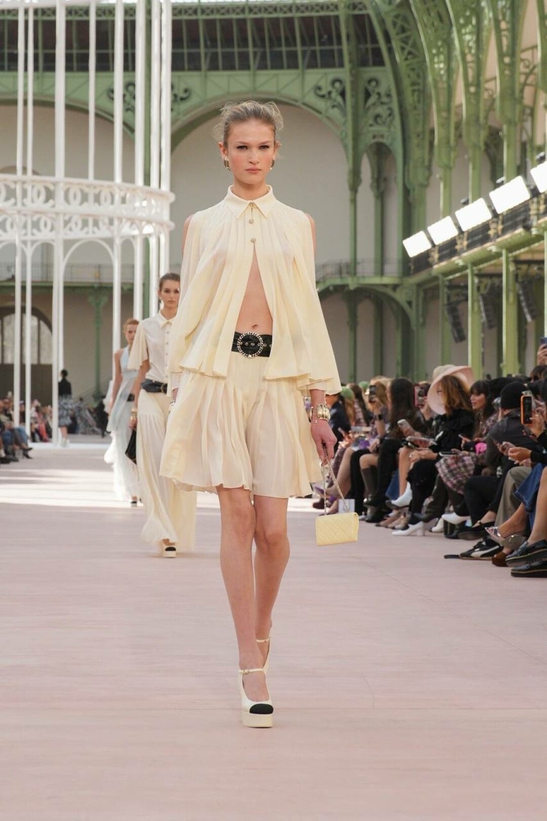 Бело-серо-черную палитру разбавляют приглушенный голубой, розовый, мятный и лимонный (не прощаемся с пастелью как минимум до следующей осени). Вслед за Чеменой Камали из Chloe дизайн-команда Chanel не проходит мимо бохо (без него в следующем сезоне никуда) — за него отвечают асимметричные платья на тонких бретелях с оборками в паре с грубым кожаным ремнем, жакеты и юбки с бахромой и полупрозрачные накидки (летняя альтернатива трендовому кейпу) в тандеме с джинсами и двойками из денима. А по примеру Sacai, Ralph Lauren и Kenzo — возвращает на подиумы платформу из нулевых в виде ботильонов со шнуровкой, мэриджейнов и босоножек.