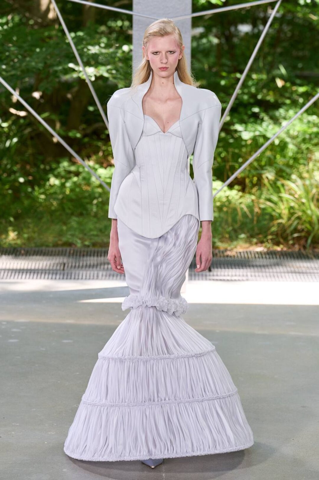В центре внимания — человеческое тело в роли полноценного арт-объекта. Видели всё: от совсем буквального на показе Germanier (между кожей модели и глазами зрителями только глиттер!) до переосмысленного на шоу Maison Margiela (Гленн Мартенс перепридумал тело по канону предшественников с помощью тугого корсета и создал иллюзию обнаженной кожи благодаря нюдовой ткани) и имитационного на подиумах Schiaparelli и Christian Dior (сочинили платья, повторяющие очертания реального тела и античной скульптуры). А в коллекции Robert Wun фигура человека превратилась в головной убор с вуалью (шок-невеста!).