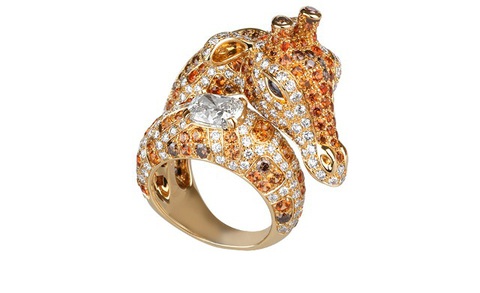 К сверкающему зоопарку французского ювелирного дома Boucheron присоединился жираф с нежными миндалевидными глазами. Сложный пятнистый окрас на его изогнутой шее создает паве из 269 бриллиантов и 137 желтых и розово-оранжевых сапфиров падпараджа.