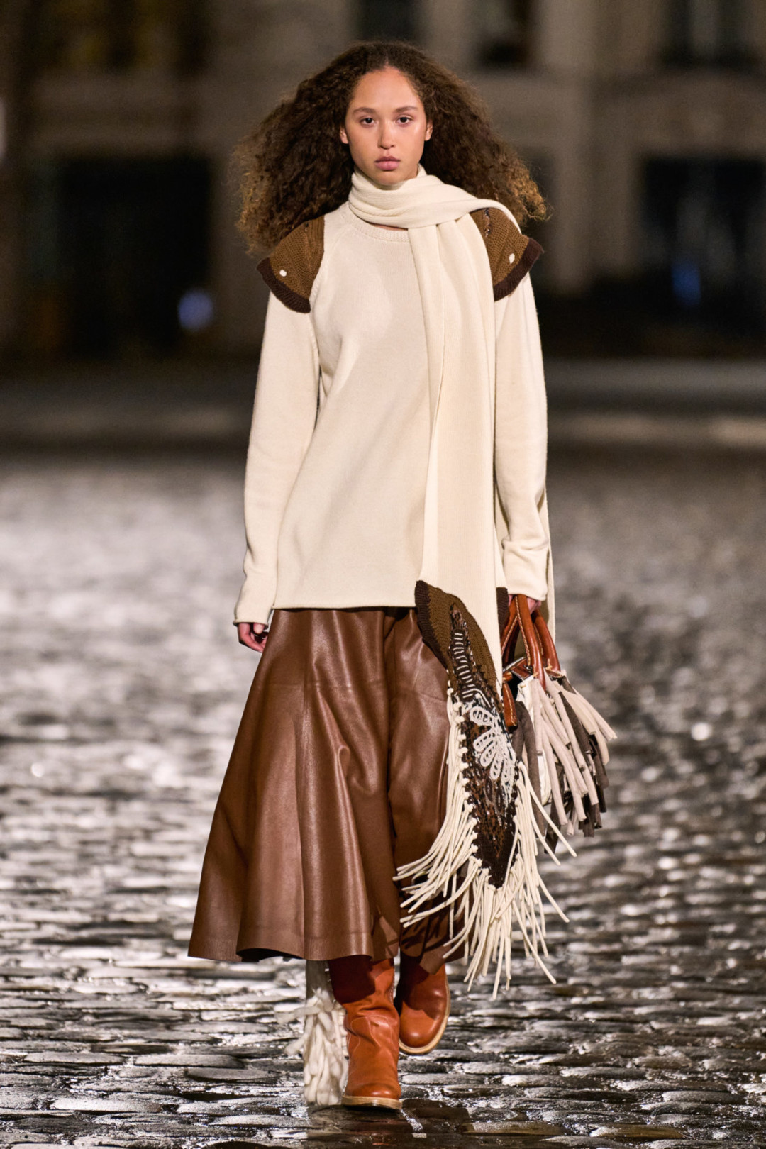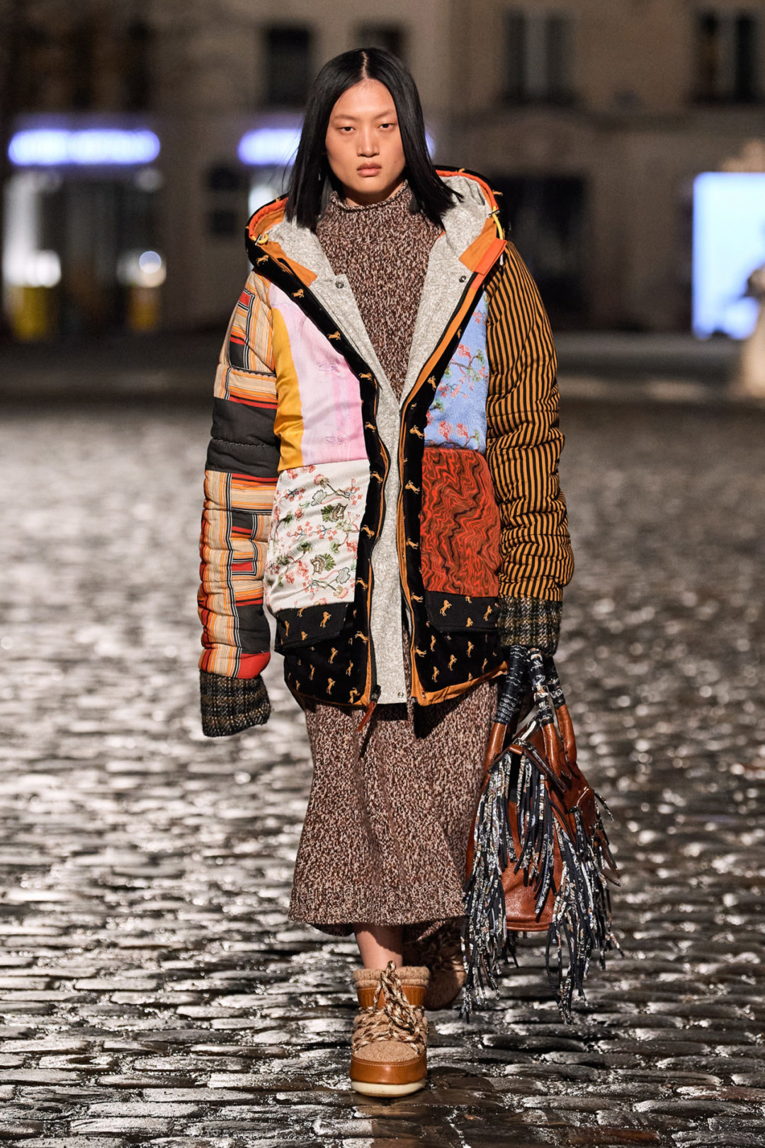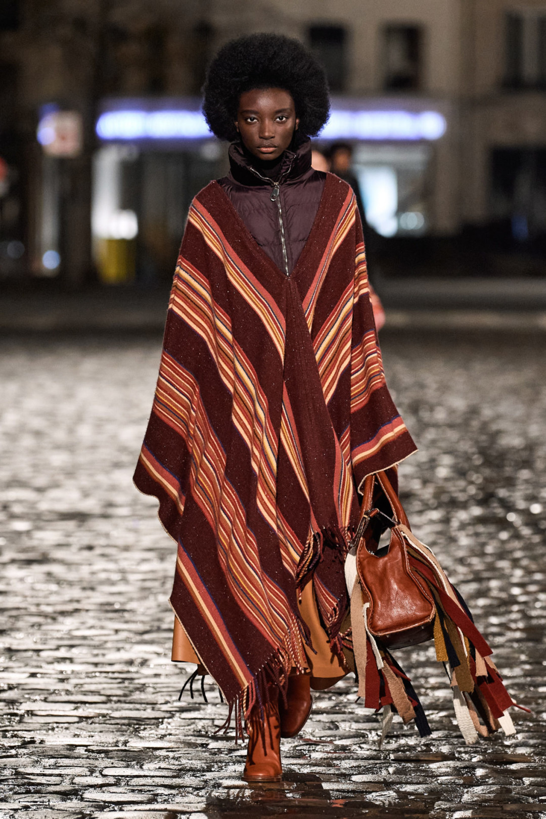 Осенне-зимняя коллекция модного дома состоит из новой версии сумки Edith, которую украсили бахрома и обрезы тканей, трикотажные платья, дубленка с отстегивающейся нижней частью, пончо с элементами пуховика и объемные куртки, созданные в технике пэчворк. Кстати, Габриэла Херст продолжила работать в sustainable-направлении (чем особо известна) и использовала при создании коллекции остатки материалов.