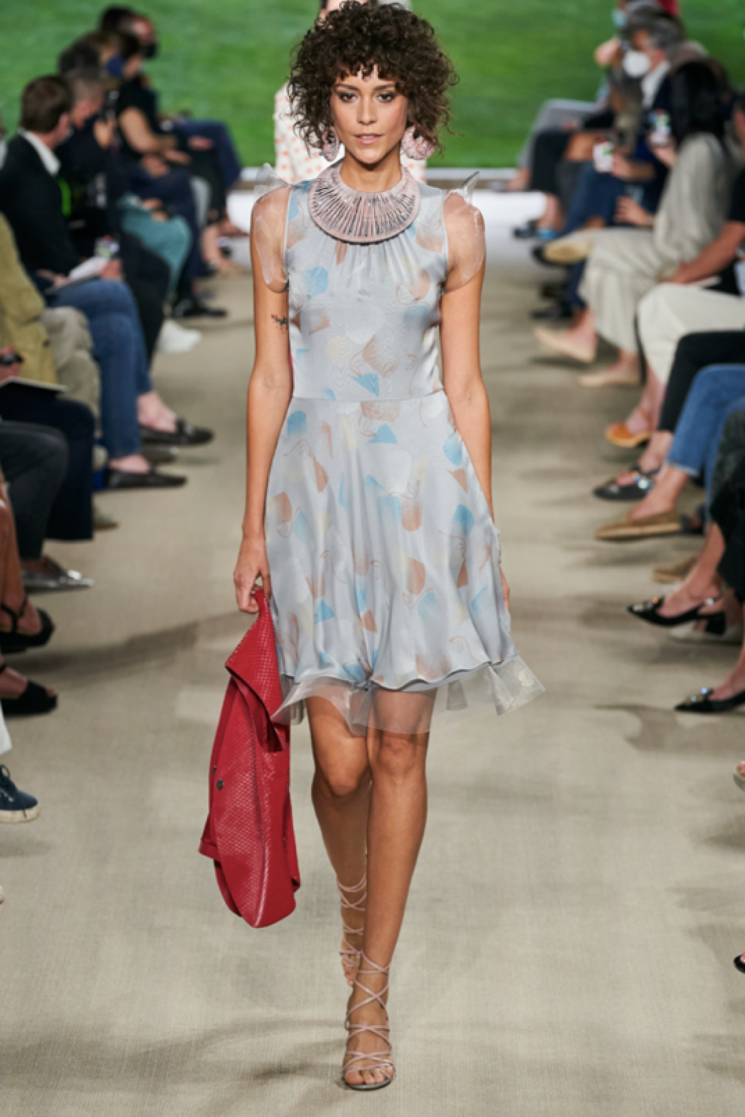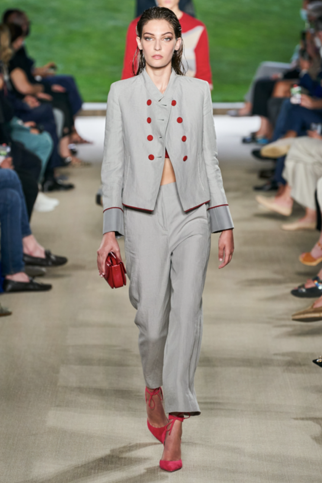 Палитра летней коллекции довольно сдержанная. Она состоит из оттенков синего, белого, серого, красного, зеленого, среди принтов — полоска и флоральные узоры. Кроме мужской коллекции, Giorgio Armani показали и женскую с шелковыми платьями, широкими брюками и брючными костюмами.