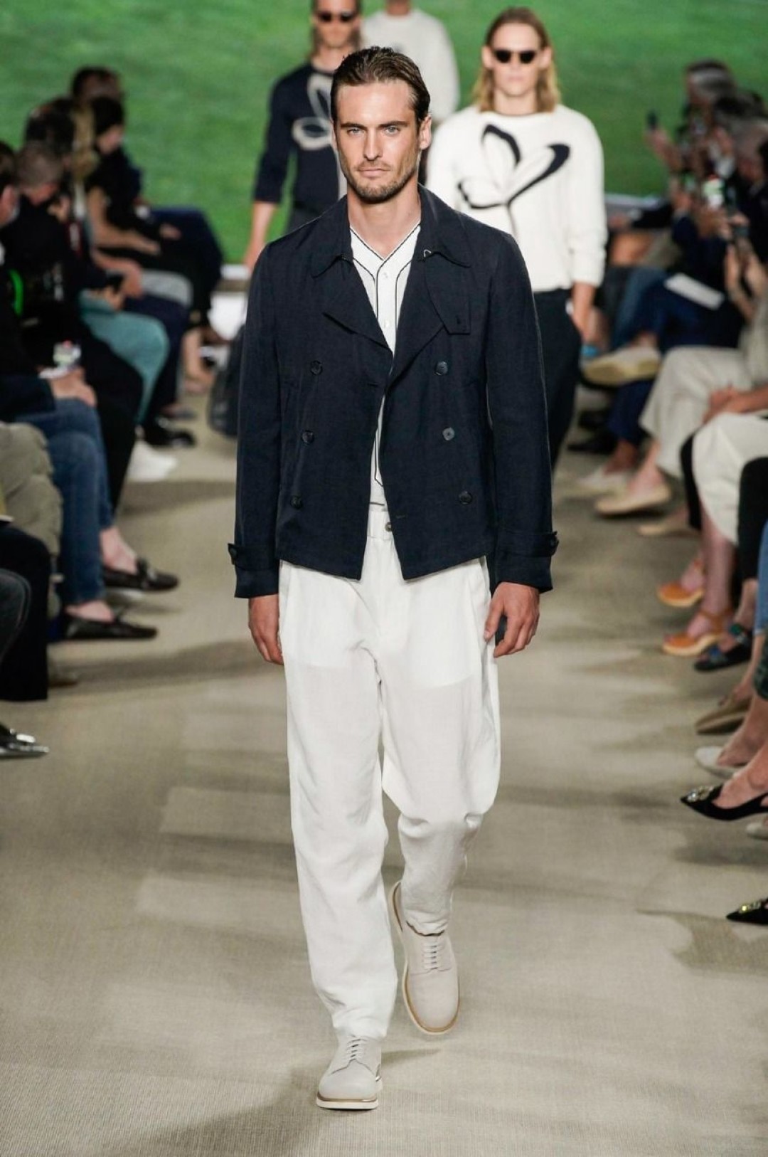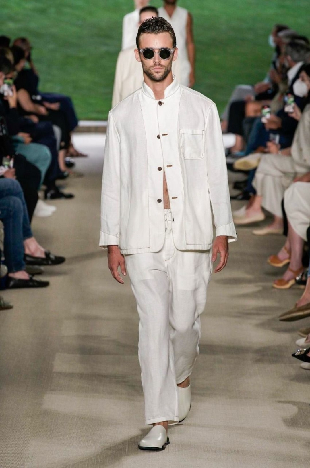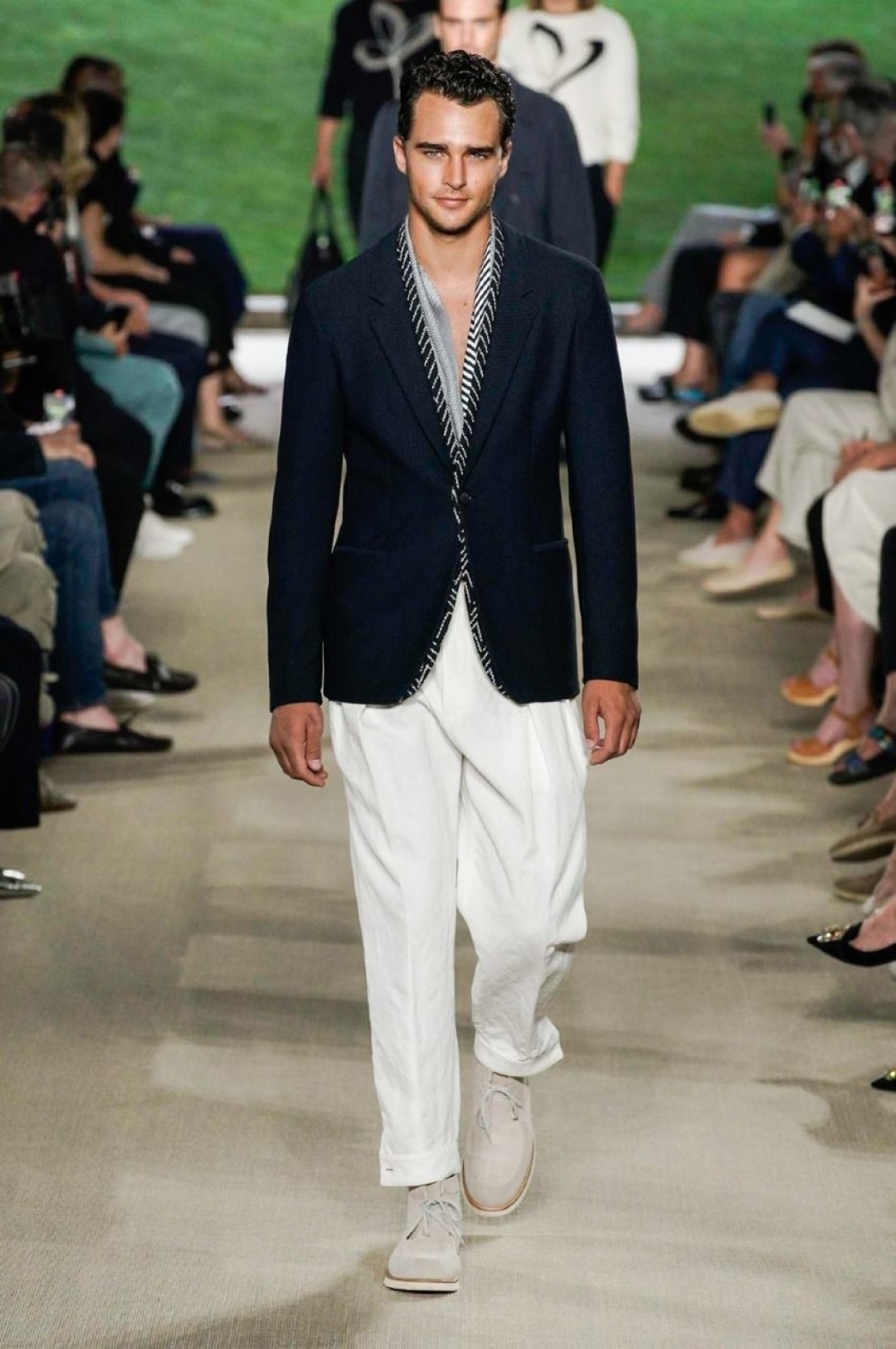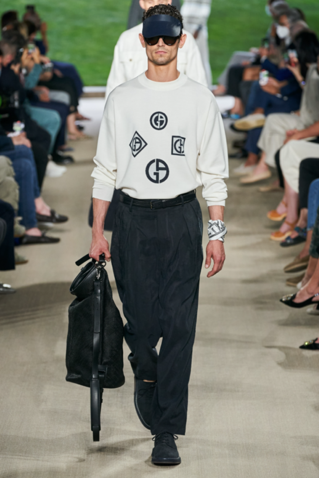 Giorgio Armani провели показ в своей штаб-квартире в Милане, на котором презентовали новую мужскую коллекцию. В нее вошли свободные брюки, в том числе, белые в комплекте с такими же рубашками, шорты, шелковые бомберы и рубашки, двубортные пиджаки, кардиганы, свитшоты с монограммой бренда. Некоторые образы дополнили шелковые платки, повязанные на руку.