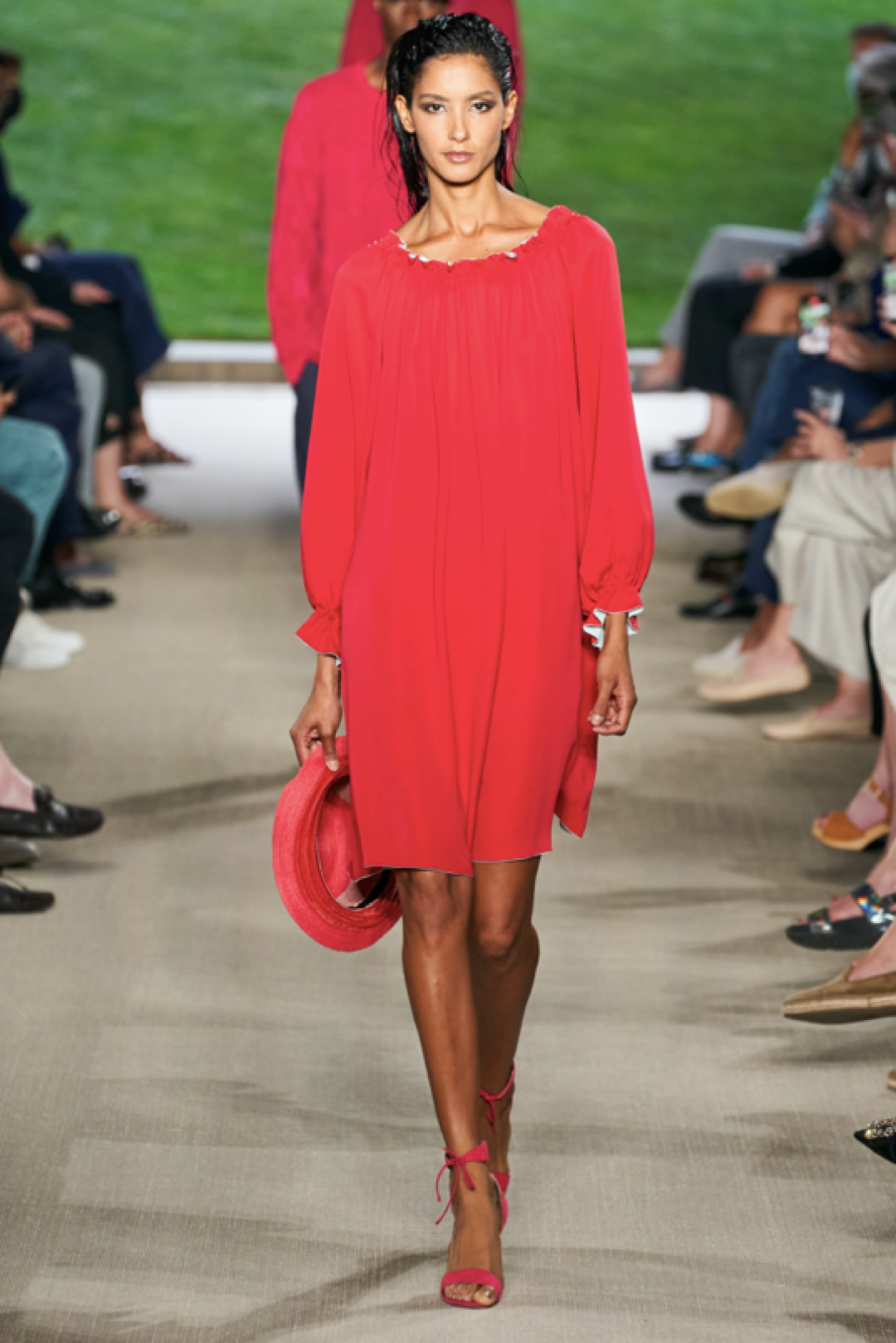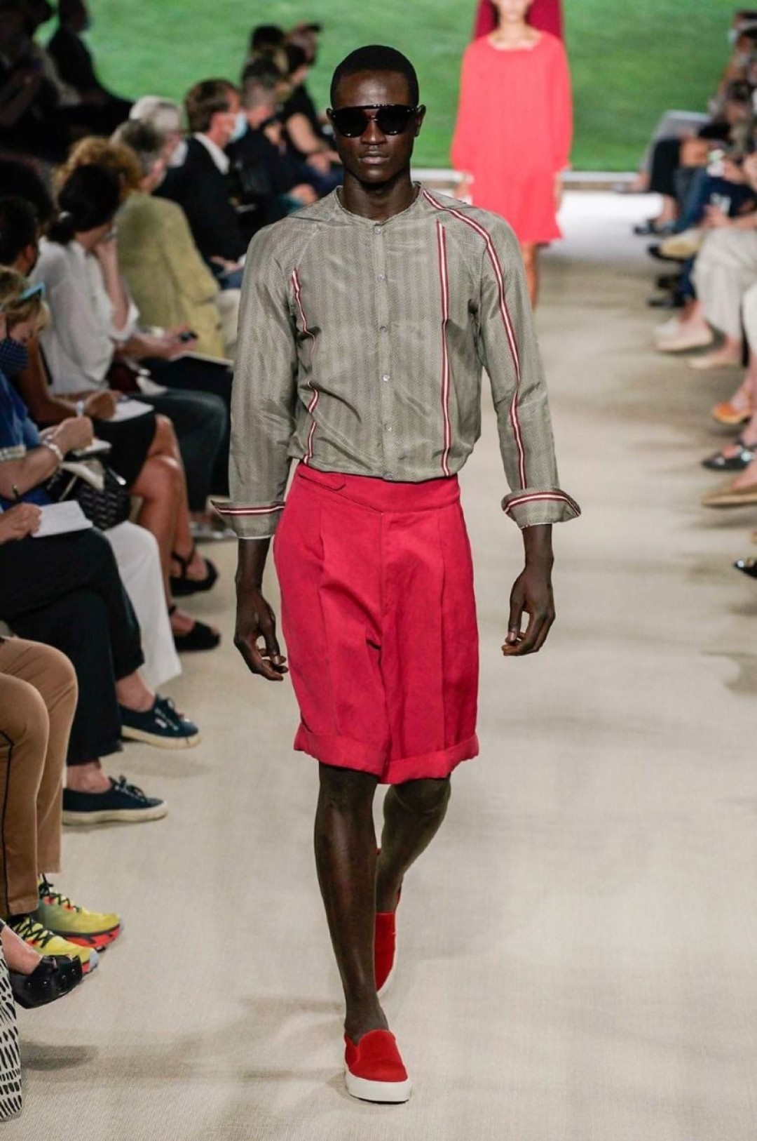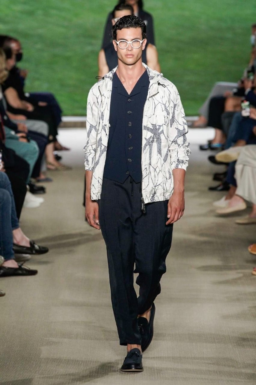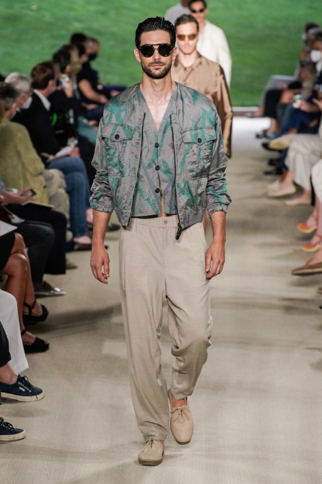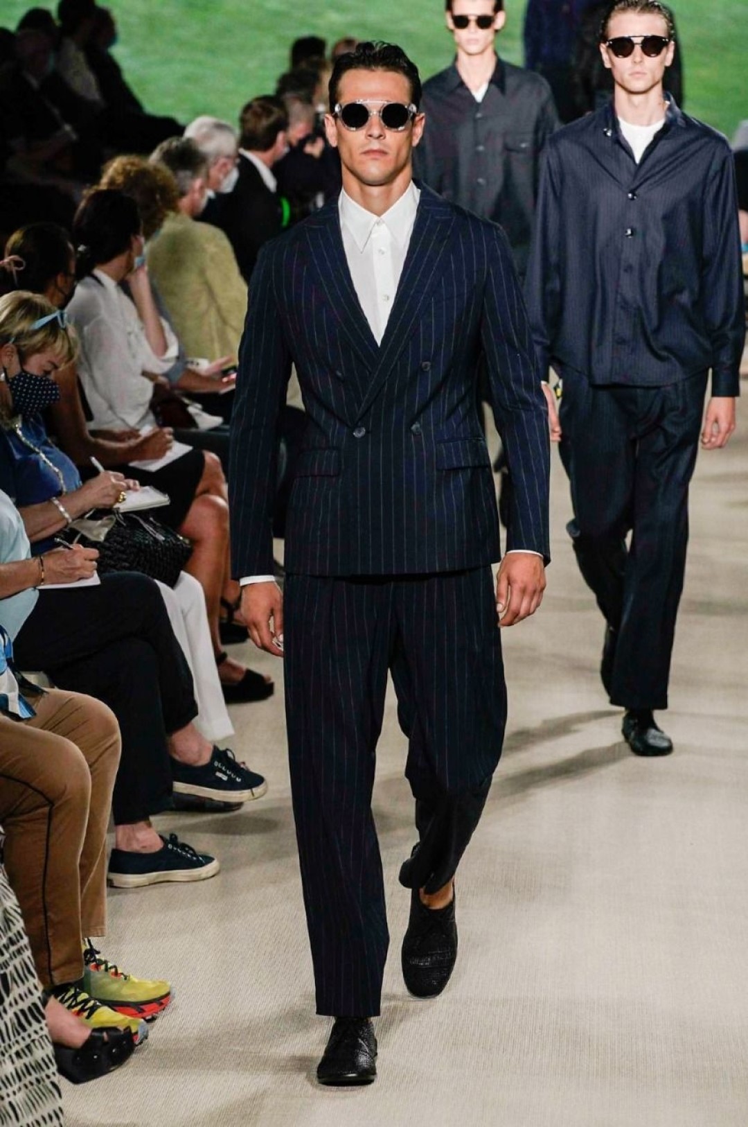 Giorgio Armani провели показ в своей штаб-квартире в Милане, на котором презентовали новую мужскую коллекцию. В нее вошли свободные брюки, в том числе, белые в комплекте с такими же рубашками, шорты, шелковые бомберы и рубашки, двубортные пиджаки, кардиганы, свитшоты с монограммой бренда. Некоторые образы дополнили шелковые платки, повязанные на руку.