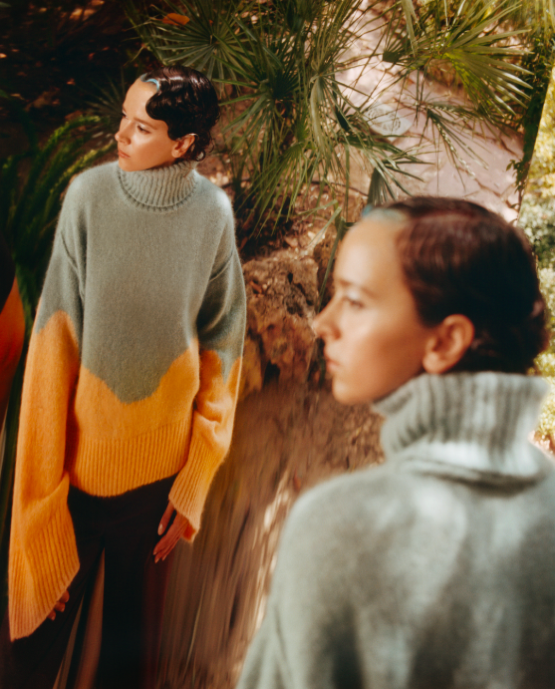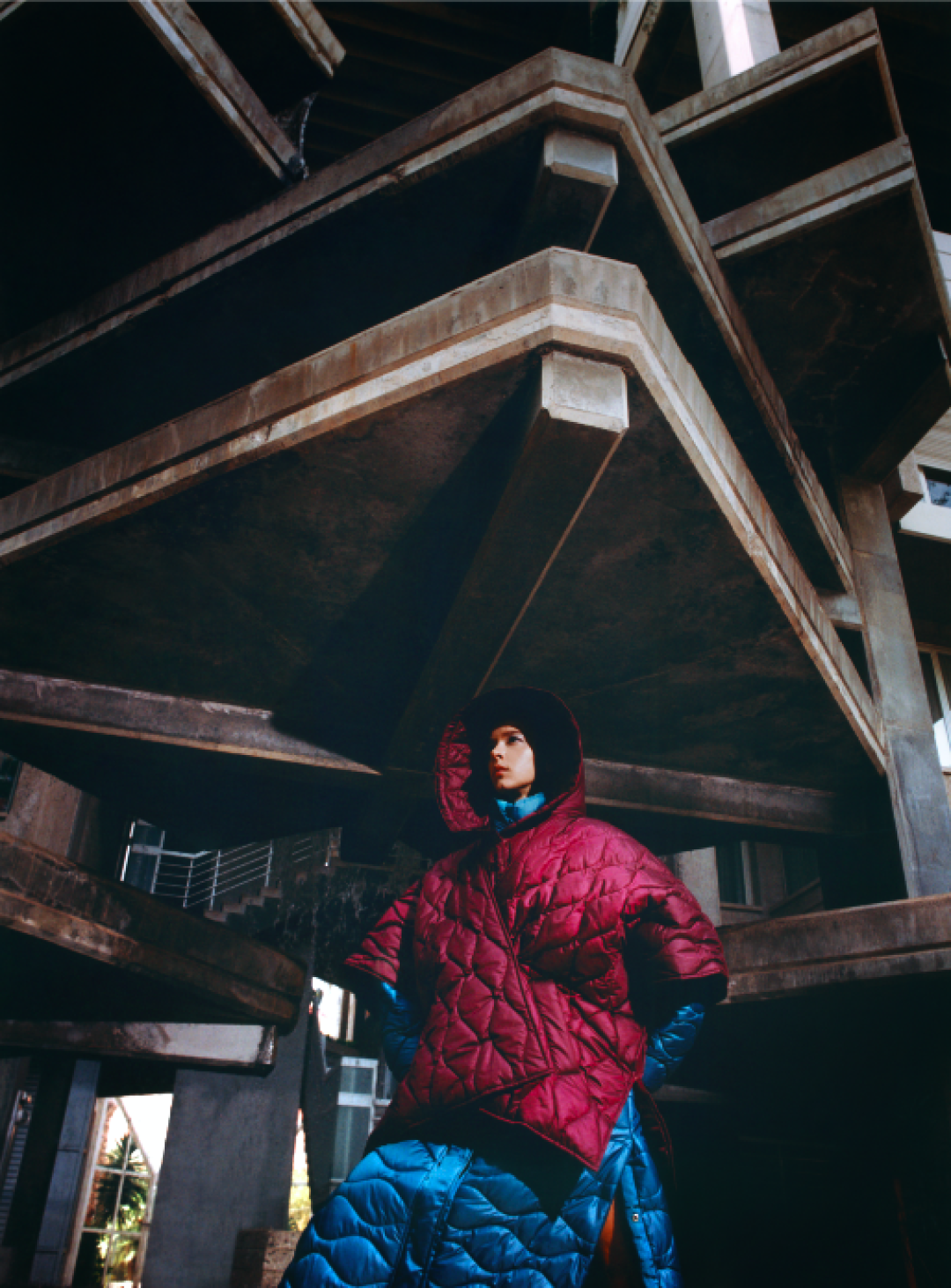 Многие образы многослойные и многофункциональные. Пальто превращаются в жилетки благодаря отстегивающимся рукавам, брюки меняют длину за счет ремешков, а куртки геометрического кроя можно носить и как толстовки, и как верхнюю одежду. Черные и серые оттенки коллекции дополнены приглушенными оранжевыми, желтыми, пастельно-розовыми, фиолетовыми, коричневыми, бордовыми ярко-синими цветами.