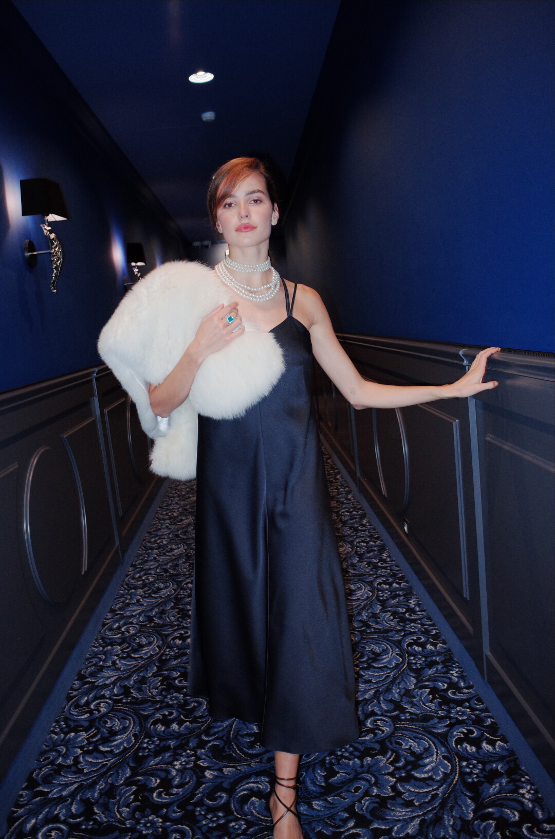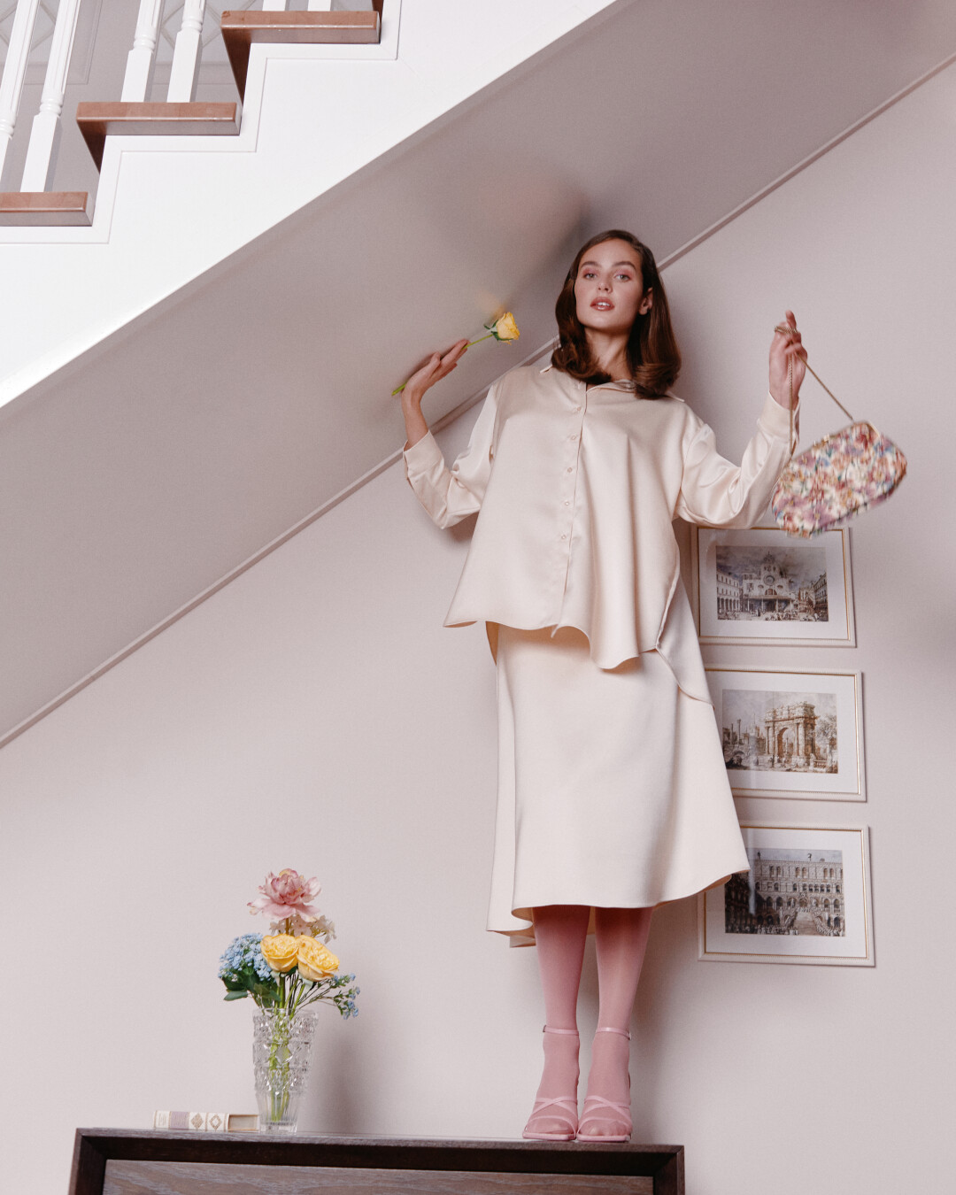 В новогоднюю капсулу, кроме свитеров, вошли атласные и шелковые блузы и платья (как макси, так и мини), смокинг, костюмы с брюками и юбками. Дизайнеры марки сделали акцент на нарядных деталях: бантах, широких лацканах и атласных пуговицах, которые рифмуются с лампасами брюк. Цветовая палитра коллекции поддерживает новогоднюю тематику — она состоит из темно-бежевого, небесно-голубого, темно-синего, черного и оттенка слоновой кости.