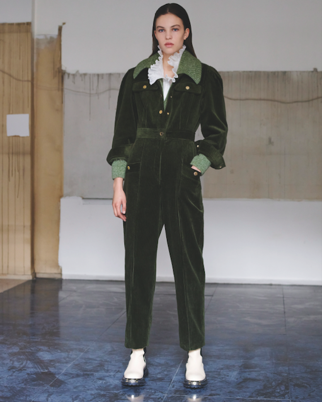 Бархатный комбинезон Sandrо — настоящий хамелеон: с футболкой и ботинками на плоском ходу становится супер униформой, с кружевной блузой и каблуками — вечерним нарядом. А этот прерафаэлитский зеленый цвет!