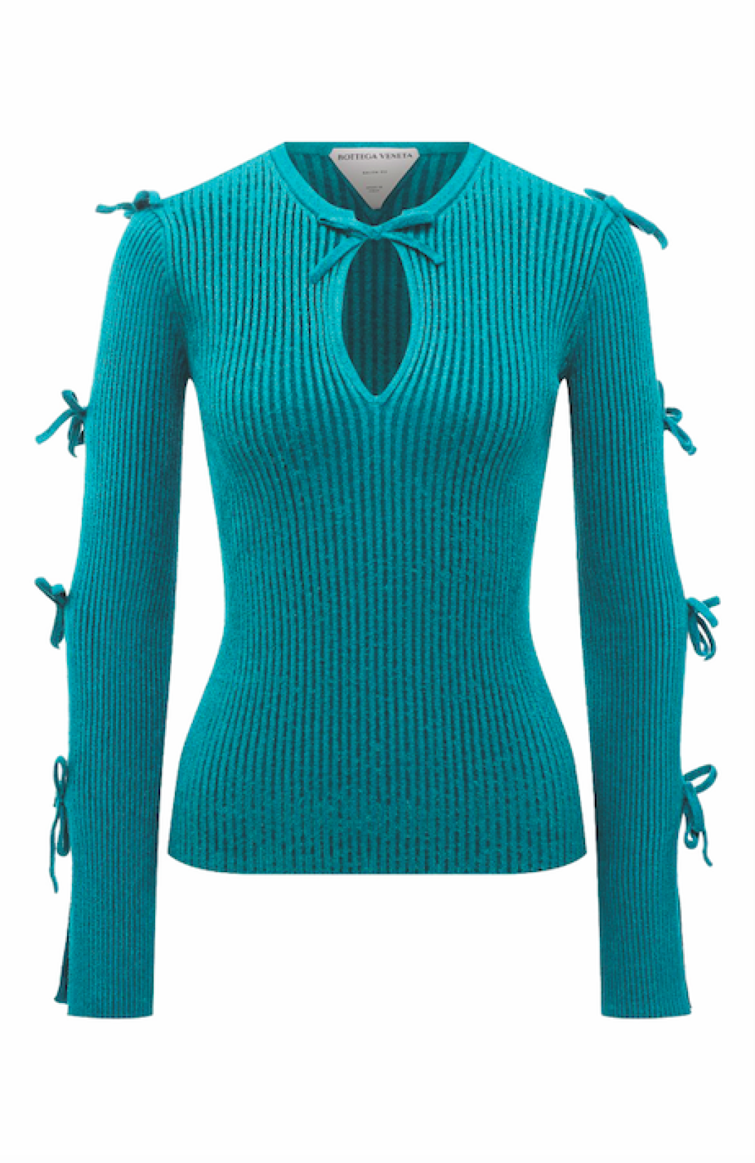 Трикотаж в рубчик, банты и цвет морской волны — вот и маст-хэв, который в Bottega Veneta умудряются сделать из всего. За новую телесность отвечают завязки по всему рукаву — представьте, как здорово их можно распустить и обнажить руки! Во-первых, это эротично. И во-вторых, тоже.