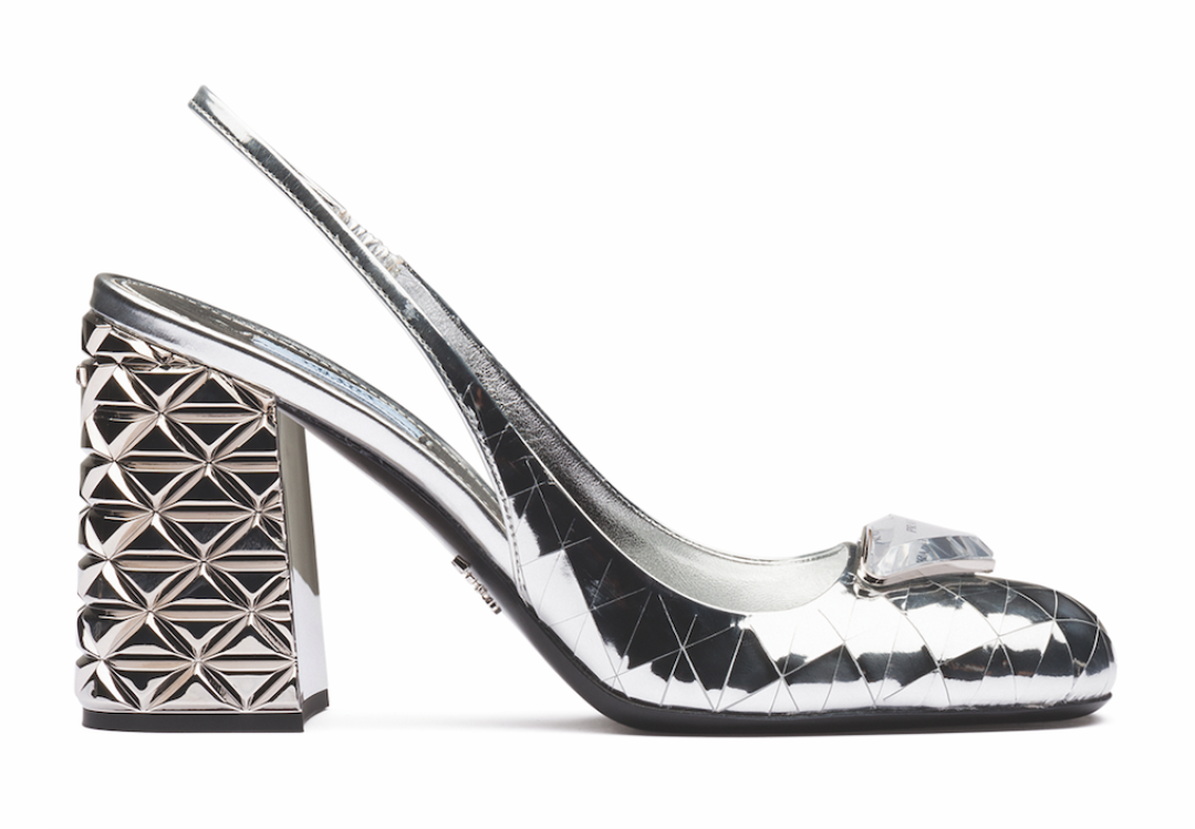 Космическая одиссея у нас дома: хотя туфли Prada формой напоминают о 1960-х, но резной архитектурный каблук и холодный блеск металла отправляют нас прямо в будущее. Кстати, треугольный логотип выполнен из плексигласа и огранен как бриллиант. Магический кристалл — 2022? Это он!