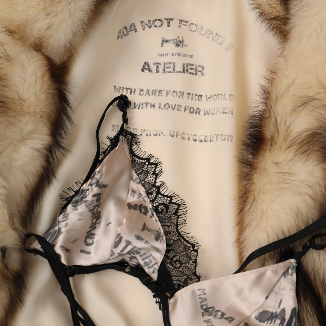 В основе коллекции — вещи из натурального меха, которым уже не один год. Их 404 NOT FOUND и превратили в новые шубы. При апсайклинге мастера бренда сделали чистку меха, изменили крой изделий, поменяли подкладку. Кроме того, каждую подкладку украсили ручная печать 404 NOT FOUND | ATELIER и фразы «with care for the world and with love for women» («с заботой о мире и с любовью к женщинам») и «made from upcycled fur» («сделано из переработанного меха»).
